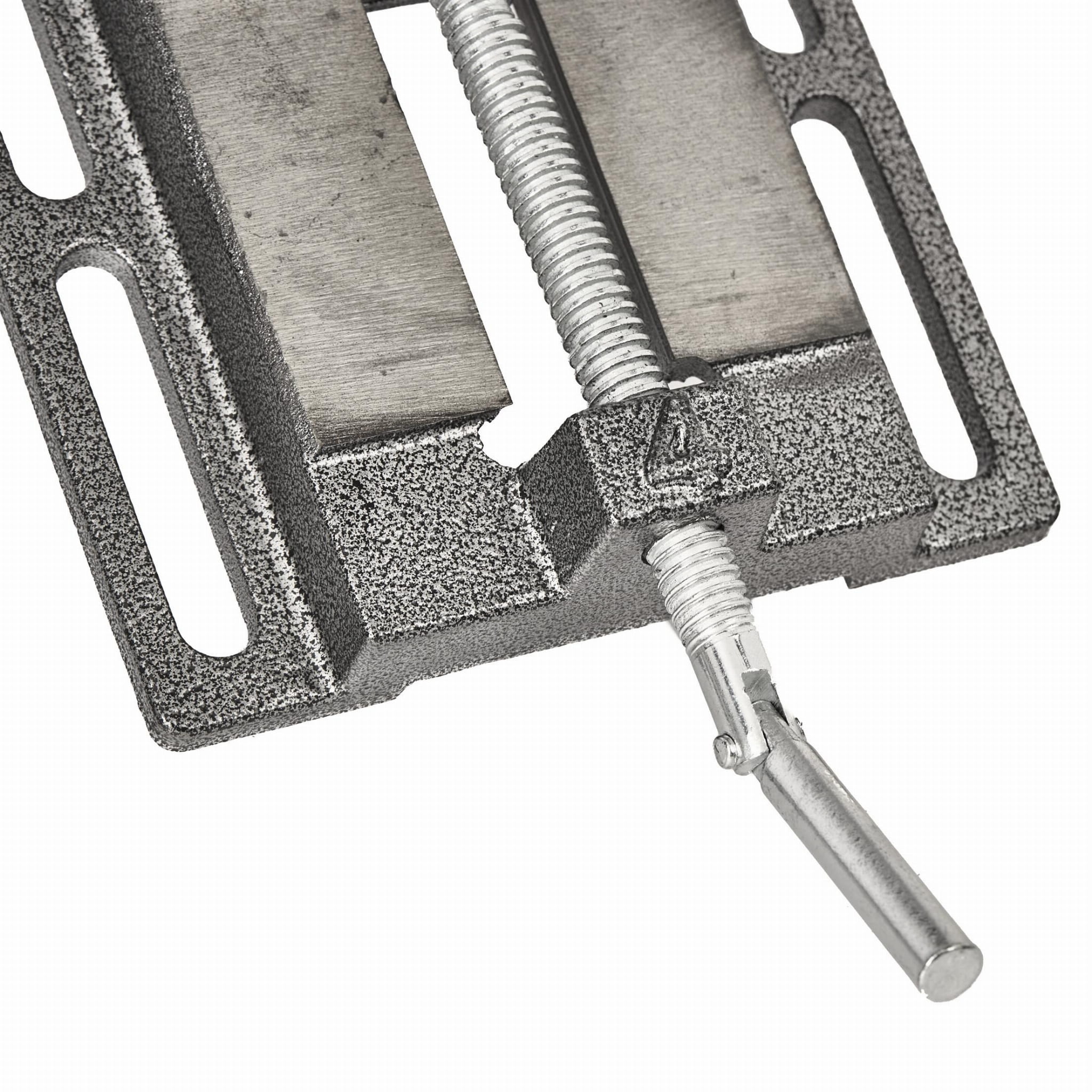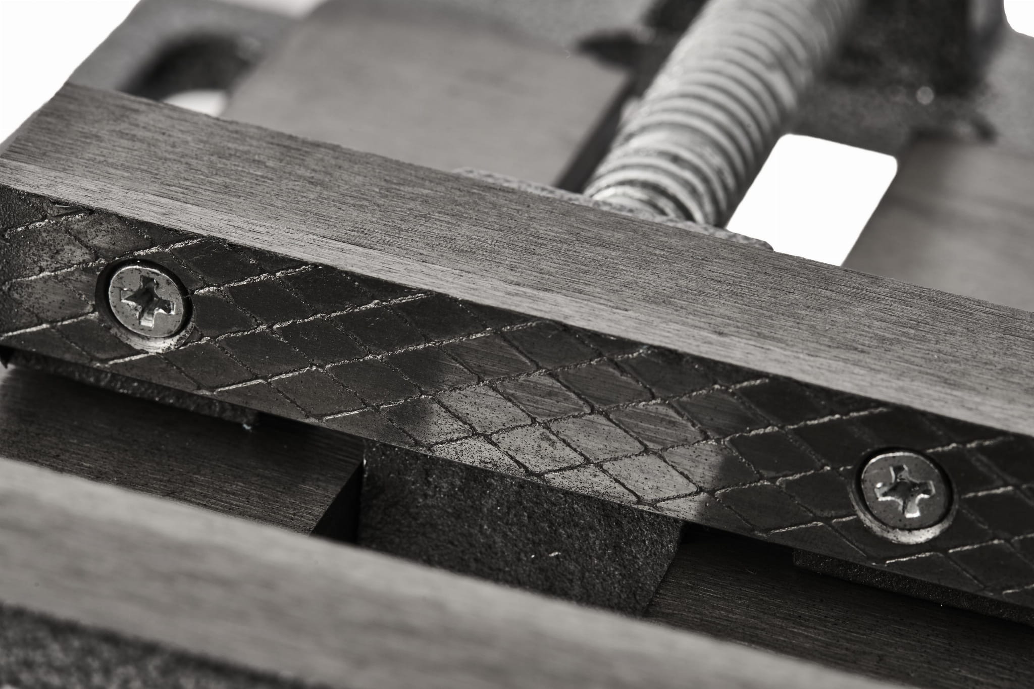Imadło mocuje się do blatu stołu warsztatowego lub płyty wiertarki stołowej za pomocą śrub przez otwory montażowe w podstawie. Przed zamocowaniem detalu należy sprawdzić, czy szczęki są czyste i wolne od wiórów, które mogłyby wpłynąć na równomierność zacisku. Żeliwny korpus wymaga ochrony przed długotrwałym działaniem wilgoci — zaleca się okresowe smarowanie śruby pociągowej i prowadnic prowadzącym smarem maszynowym.