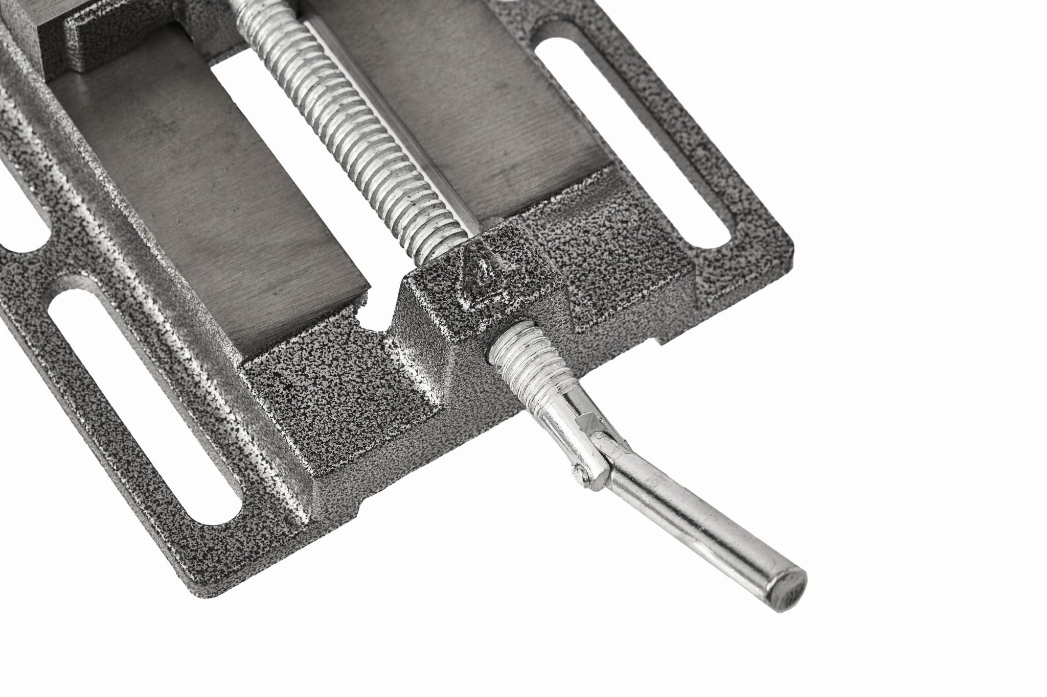 Moletowanie powierzchni pokrętła zapewnia pewny chwyt nawet w rękawicach roboczych. Luźna przetyczka umożliwia szybkie dokręcanie i luzowanie szczęk bez konieczności użycia dodatkowych narzędzi, co skraca czas przygotowania stanowiska.