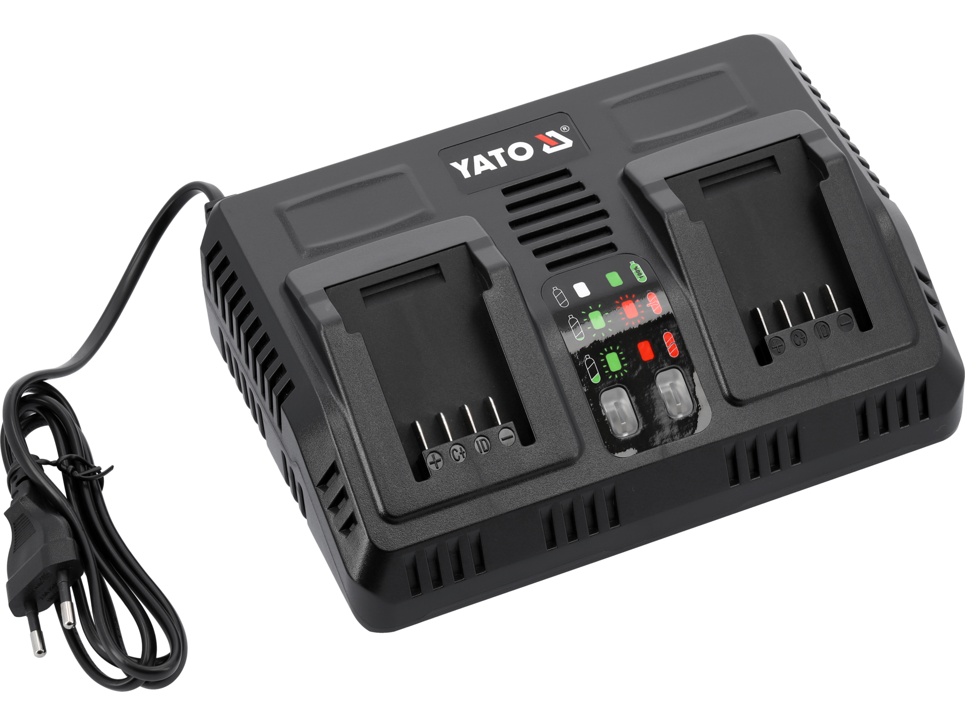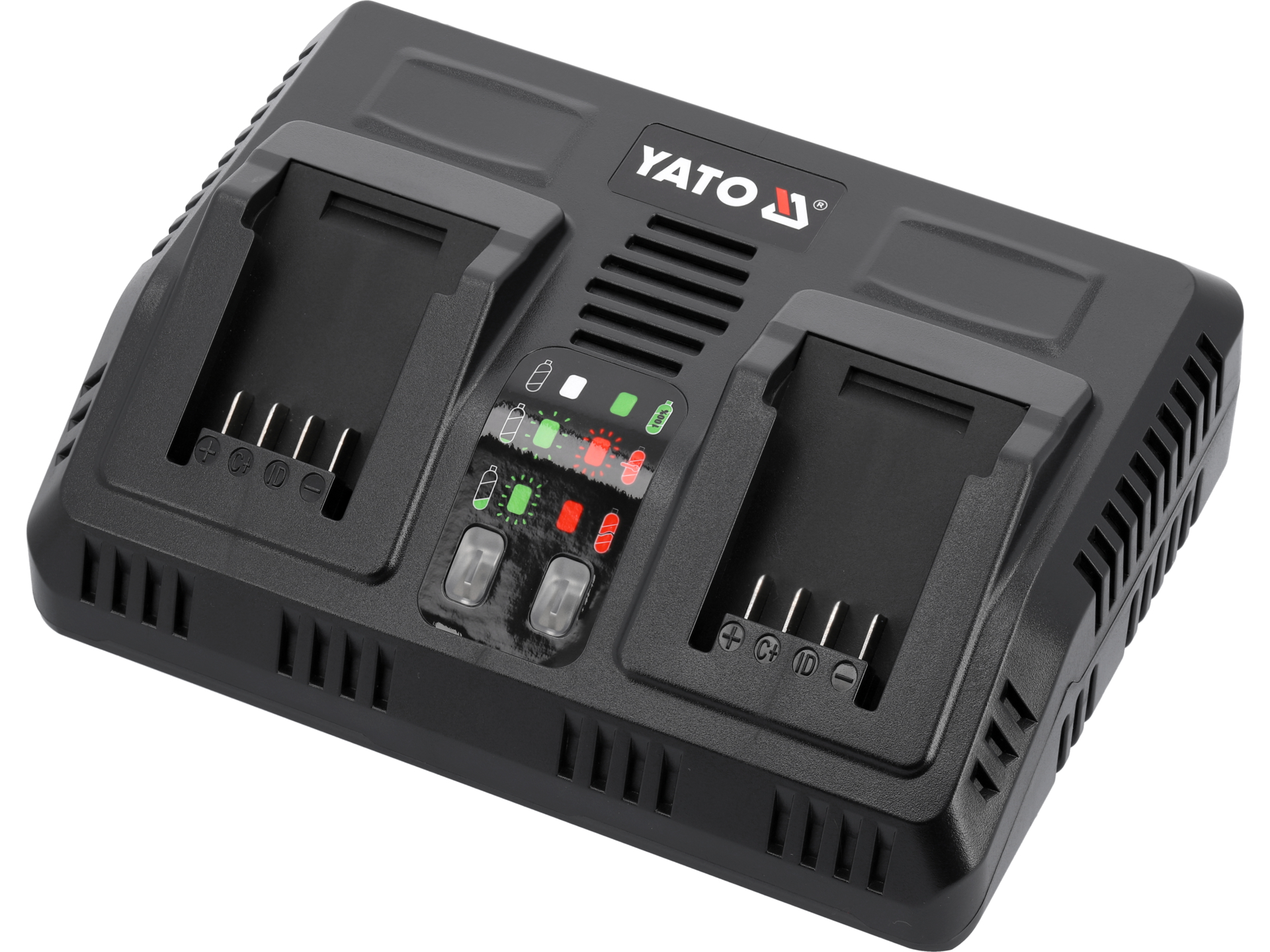 Ładowarka dwustanowiskowa do akumulatorów Li-Ion 18V z systemu Yato, umożliwiająca jednoczesne ładowanie dwóch baterii z prądem wyjściowym 4,5A na port. Wyposażona w system monitorowania temperatury i automatyczne zarządzanie procesem ładowania.