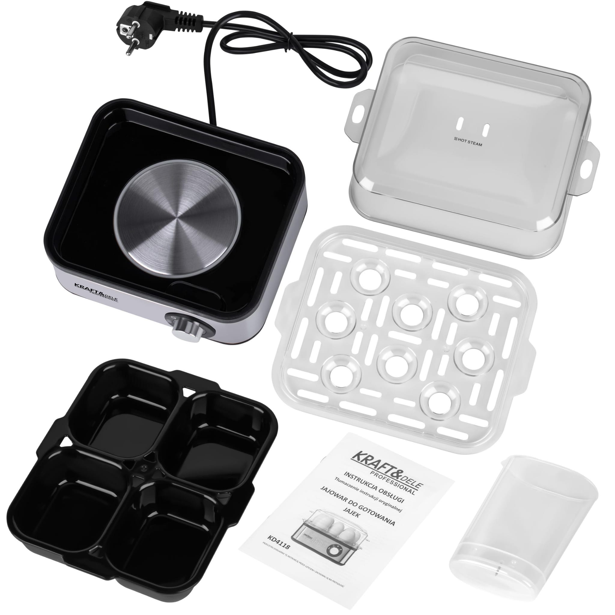 | Zawartość zestawu | Jajowar, miarka z nakłuwaczem, pokrywka parowa, podstawka na jajka, instrukcja obsługi (PL) |