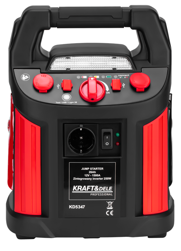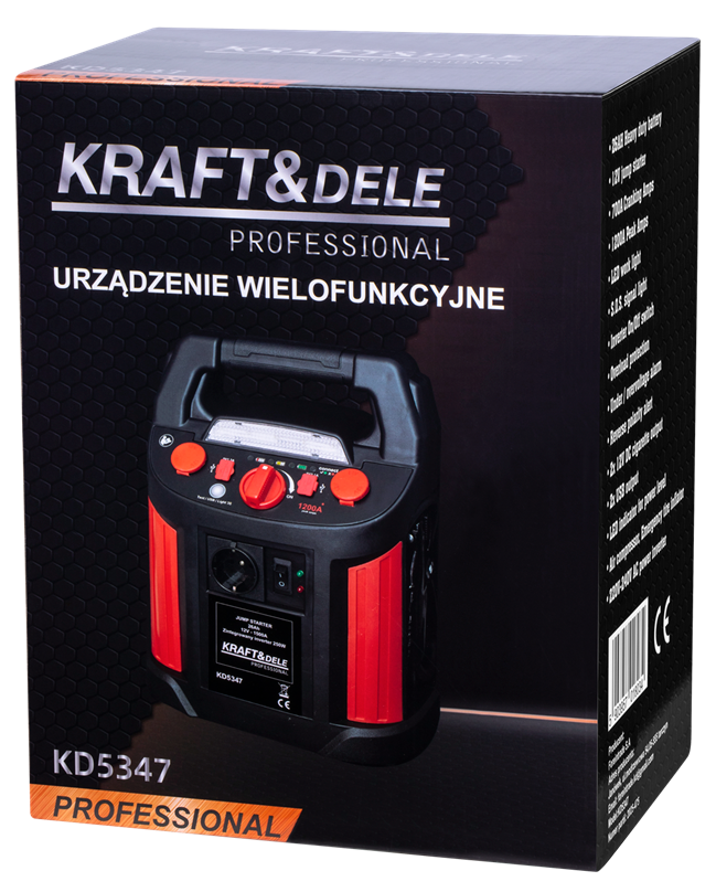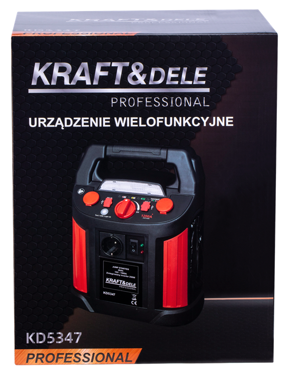 KD5347 to urządzenie łączące pięć funkcji w jednej obudowie: booster rozruchowy 12V, inwerter 230V, kompresor powietrza, powerbank USB oraz panel oświetleniowy LED. Akumulator AGM o pojemności 26 Ah zapewnia wielokrotne użycie bez konieczności podłączenia do zewnętrznego zasilania.