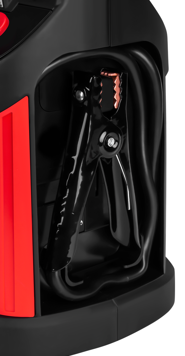 Zaciski rozruchowe oraz wężyk kompresora przechowywane są w dedykowanych schowkach zamykanych klapkami, co chroni elementy przed zabrudzeniem i mechanicznym uszkodzeniem podczas transportu. Rozwiązanie to ułatwia też szybkie przygotowanie urządzenia do użycia w sytuacji awaryjnej.