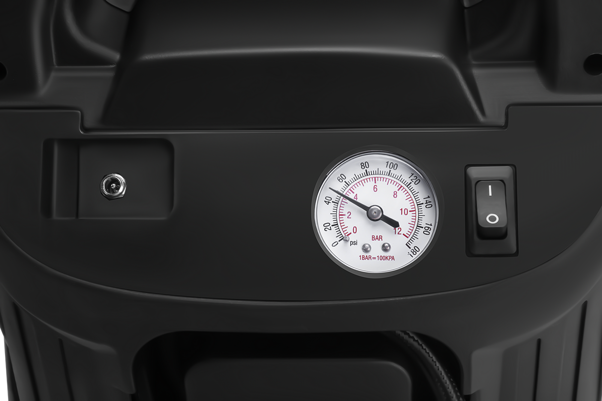 Zintegrowany kompresor osiąga ciśnienie robocze do 11 bar, co pokrywa wymagania opon samochodowych (typowo 2–3,5 bar), opon rowerowych, materacy pompowanych oraz sprzętu sportowego. Manometr umożliwia kontrolę ciśnienia podczas pompowania bez konieczności stosowania zewnętrznego miernika. Wężyk kompresora przechowywany jest w dedykowanym schowku z klapką.