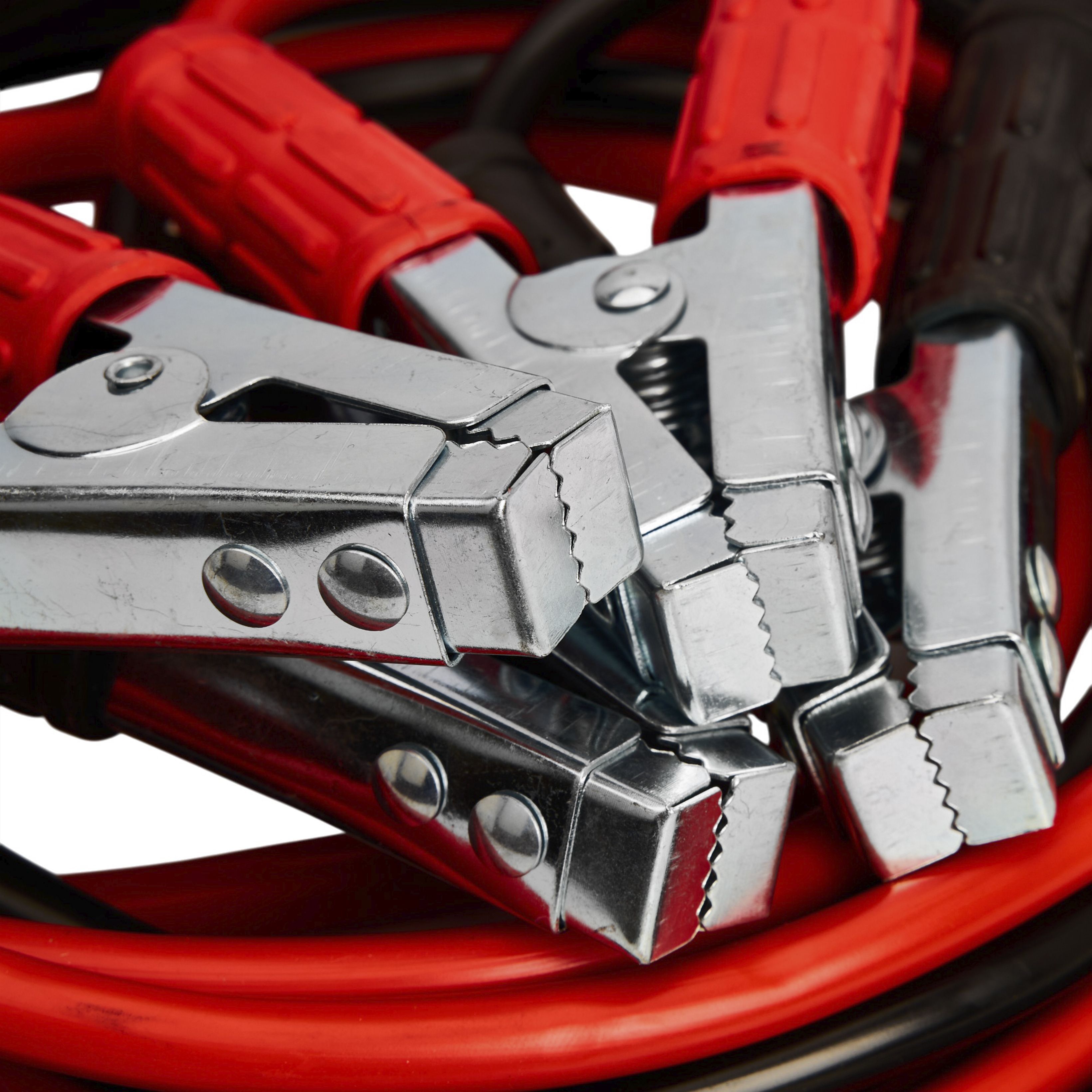Klemy o szerokim rozstawieniu i mocnych sprężynach ułatwiają stabilne podpięcie do akumulatora.