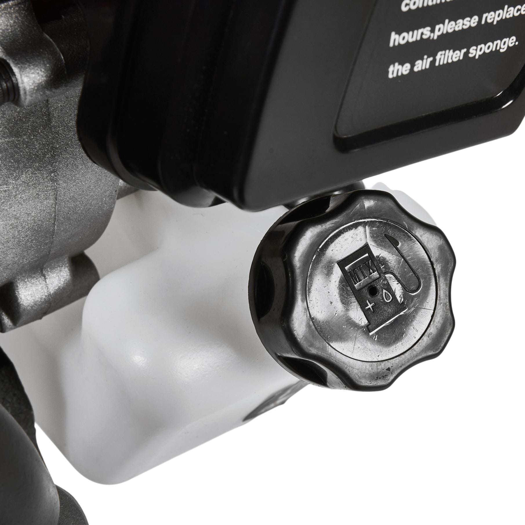 Jednocylindrowy silnik 2-suwowy nie wymaga oleju silnikowego w oddzielnym układzie smarowania — olej dodawany jest bezpośrednio do paliwa w proporcji 25:1. Chłodzenie powietrzem eliminuje układ wodny, co zmniejsza masę urządzenia i upraszcza obsługę w terenie.