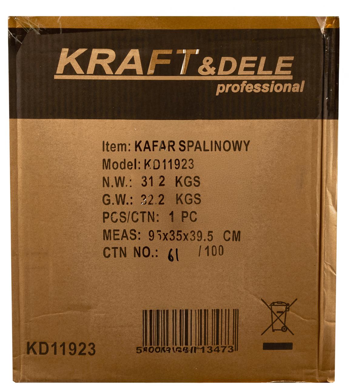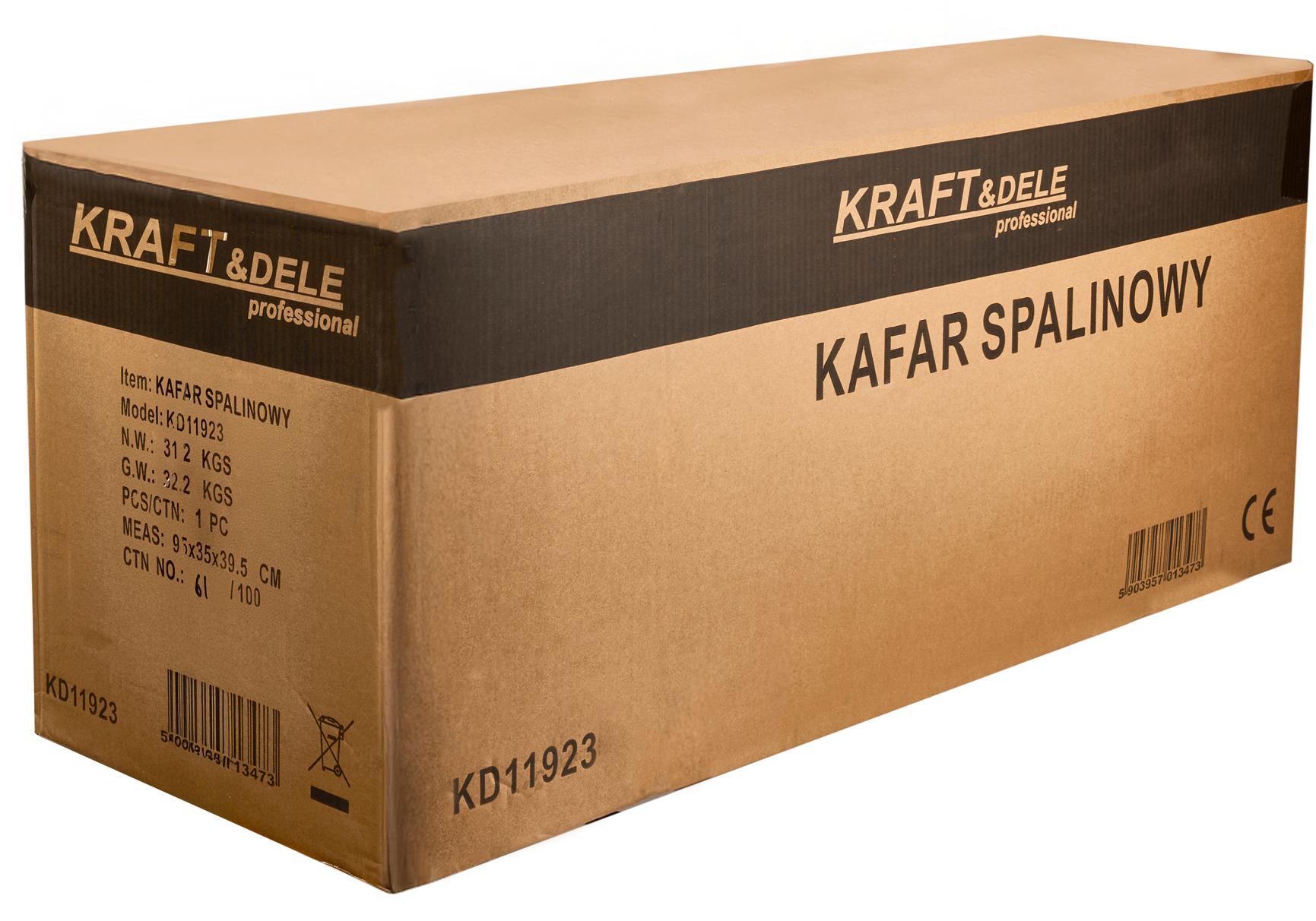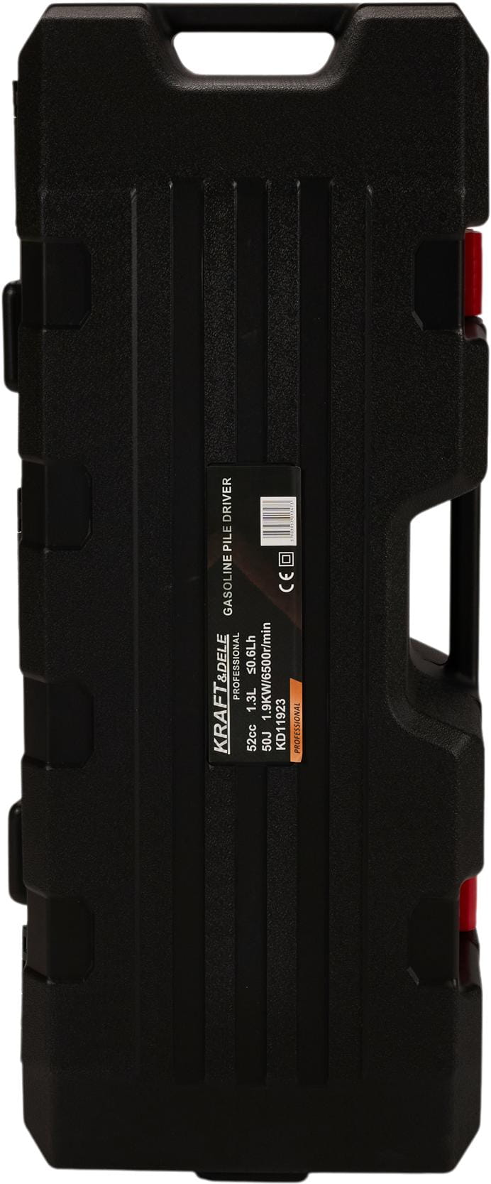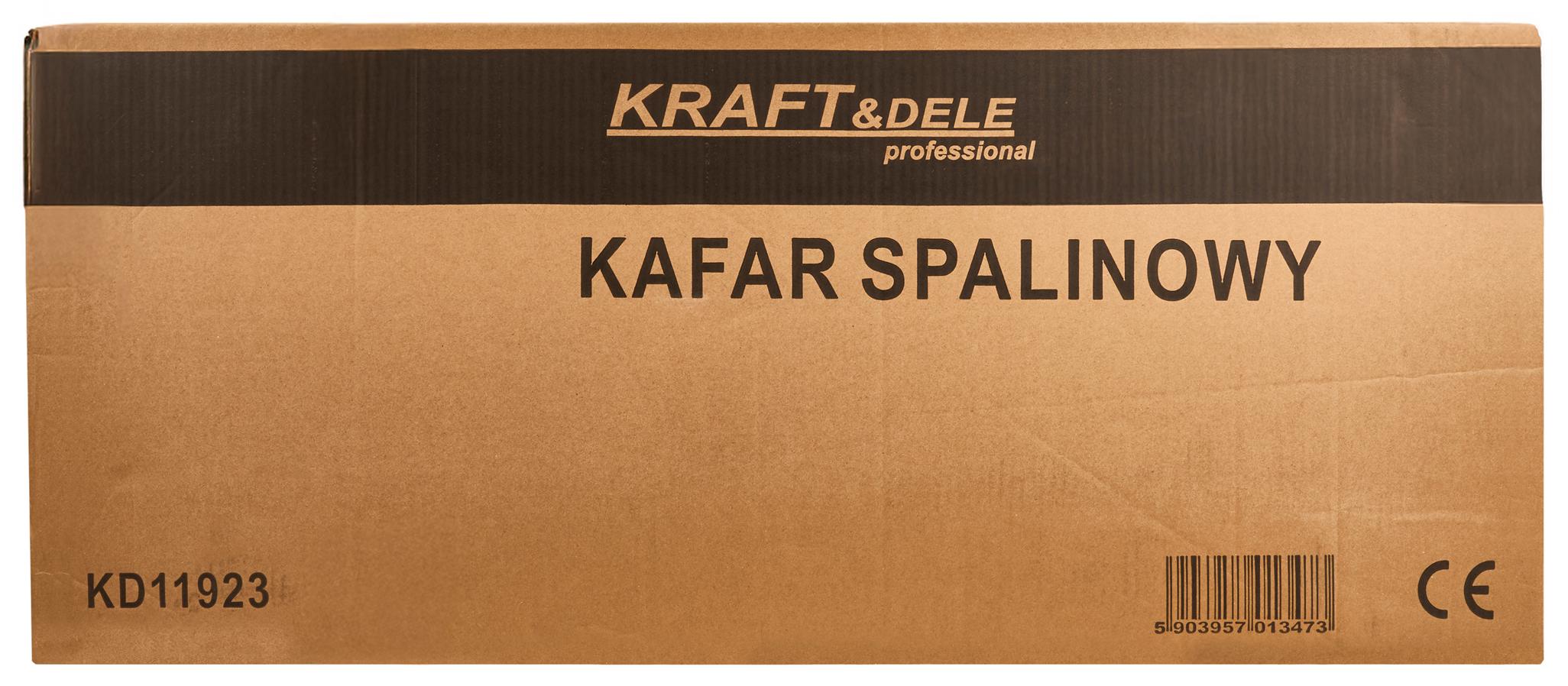 Kafar spalinowy KD11923, lejek, smar, śrubokręt, klucz płaski, 3 klucze imbusowe, 3 pierścienie redukcyjne (49 / 69 / 100 mm), pojemnik do mieszanki paliwowej, materiałowa saszetka na akcesoria, walizka z tworzywa sztucznego z dwoma uchwytami i kółkami transportowymi, instrukcja obsługi w języku polskim.
