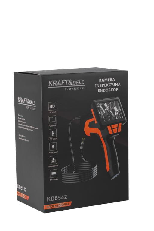 KD5542 to przemysłowa kamera inspekcyjna z wbudowanym ekranem LCD 4,3" i akumulatorem 3000 mAh, przeznaczona do diagnostyki trudno dostępnych przestrzeni bez konieczności demontażu podzespołów. Sonda o średnicy 8 mm i długości 5 m umożliwia inspekcję rur, kanałów, silników oraz innych zamkniętych przestrzeni, a stopień ochrony IP68 obiektywu pozwala na pracę w wilgotnym i zabrudzonym środowisku.