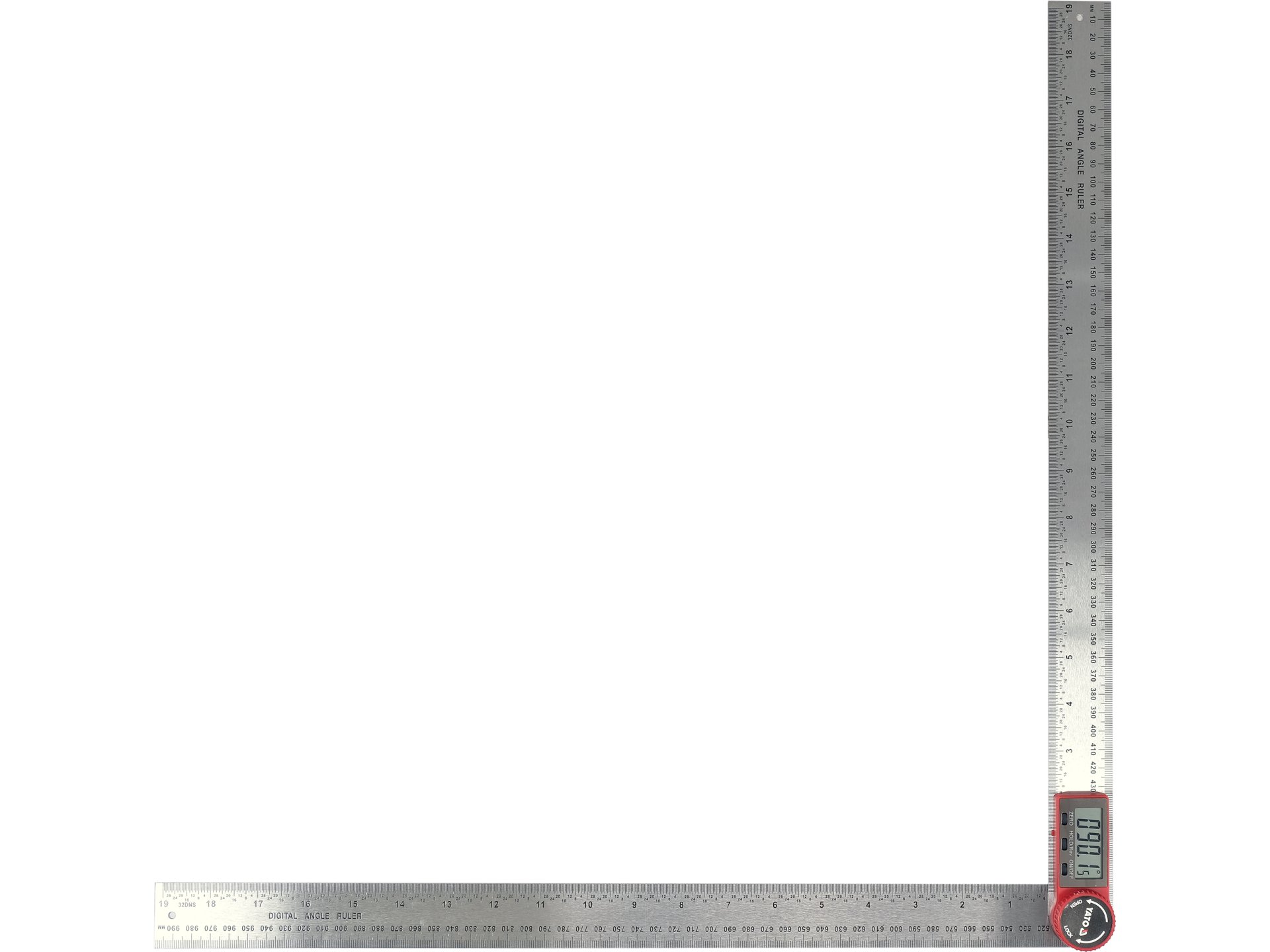 Elektroniczny przyrząd pomiarowy z cyfowym odczytem kąta, przeznaczony do precyzyjnego pomiaru i przenoszenia kątów w zakresie pełnego obrotu. Metalowa konstrukcja z ramionami o długości 500 mm zapewnia stabilność podczas pracy z większymi elementami.
