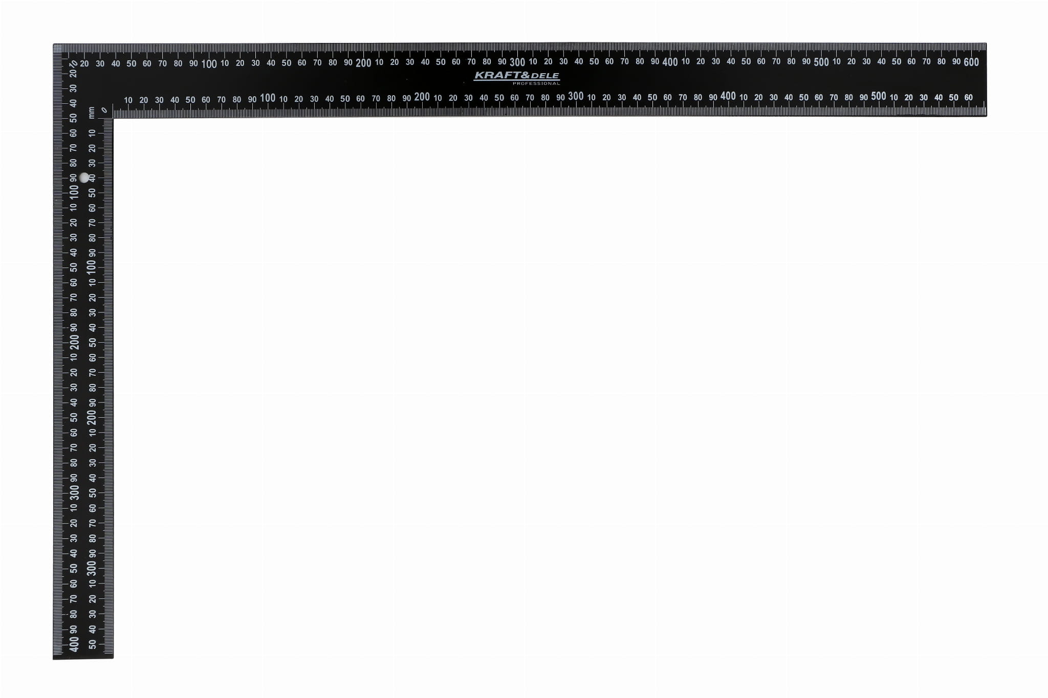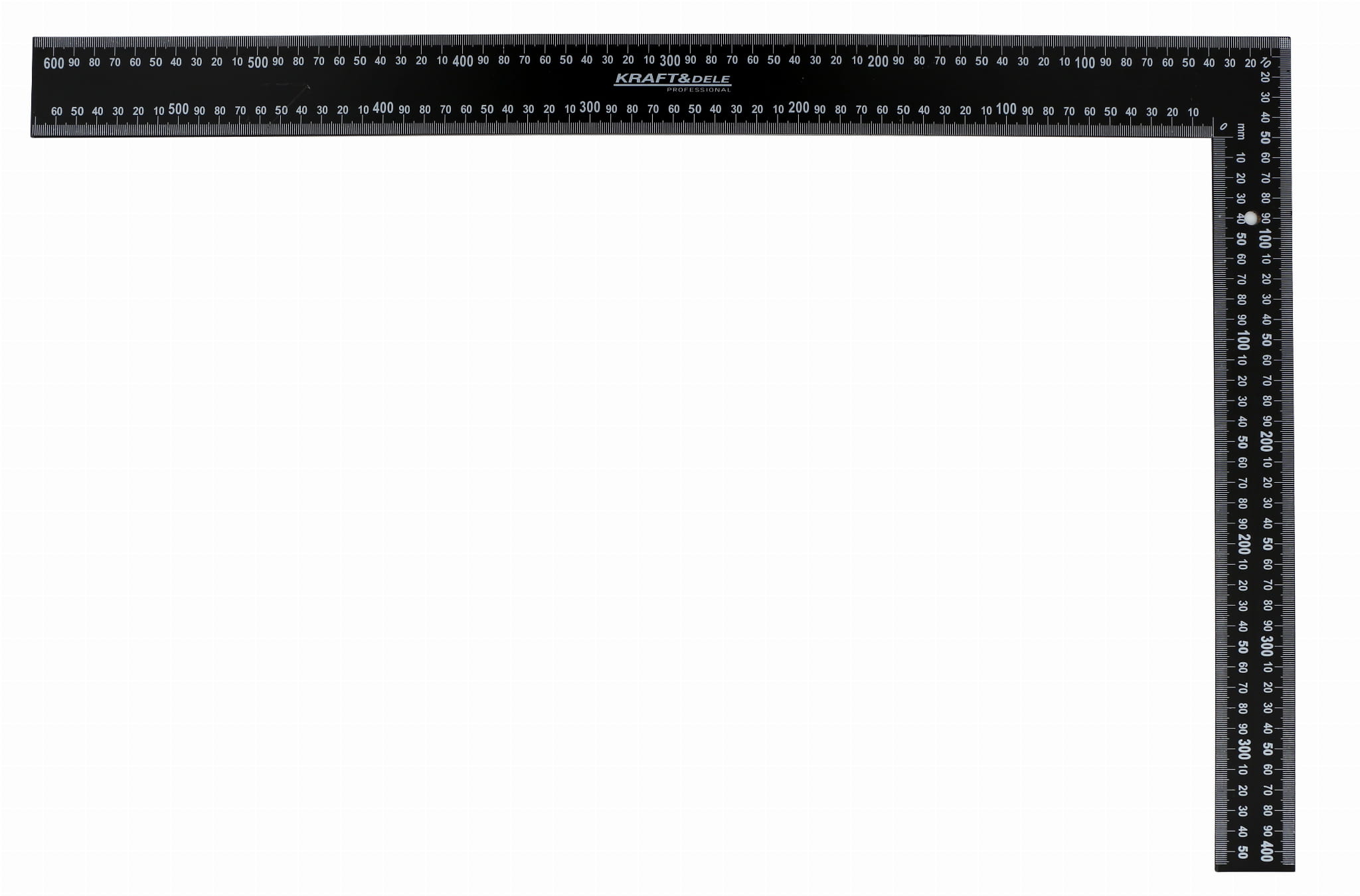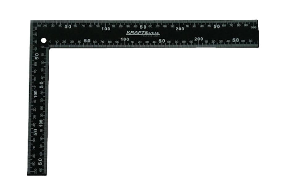 Podziałka naniesiona po obu stronach obu ramion pozwala na odczyt wymiarów bez obracania narzędzia. Ułatwia jednoczesne odmierzanie odległości i wyznaczanie kąta prostego w jednym ustawieniu.