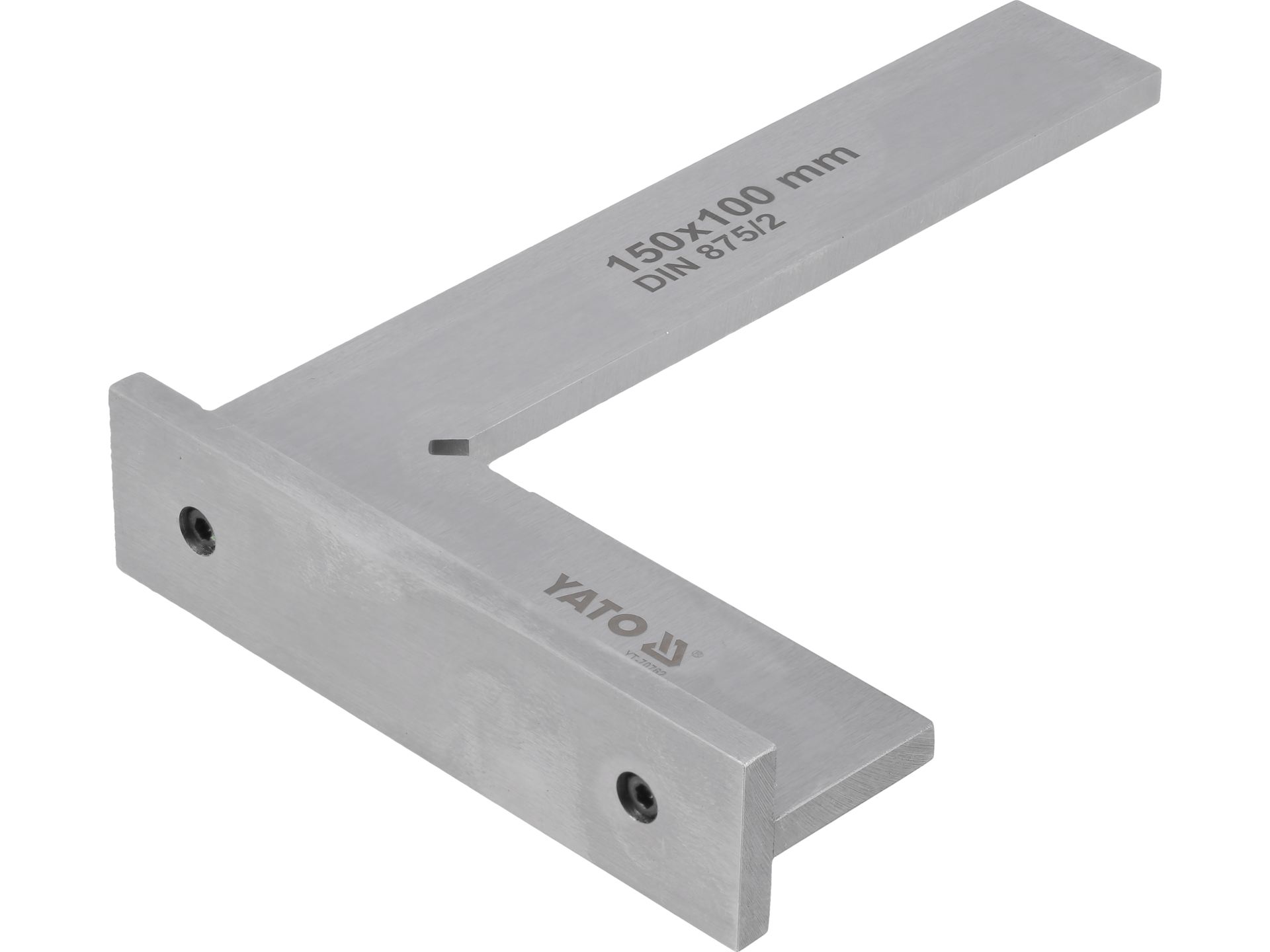 Norma DIN 875 definiuje klasy dokładności kątowników ślusarskich. Klasa II (druga klasa dokładności) określa maksymalne odchyłki kąta prostego w zależności od długości ramienia. Dla kątownika 150 mm dopuszczalna odchyłka wynosi około 0,04 mm na długości ramienia, co odpowiada dokładności wystarczającej dla większości prac warsztatowych, montażowych i kontrolnych w przemyśle metalowym oraz stolarstwie.