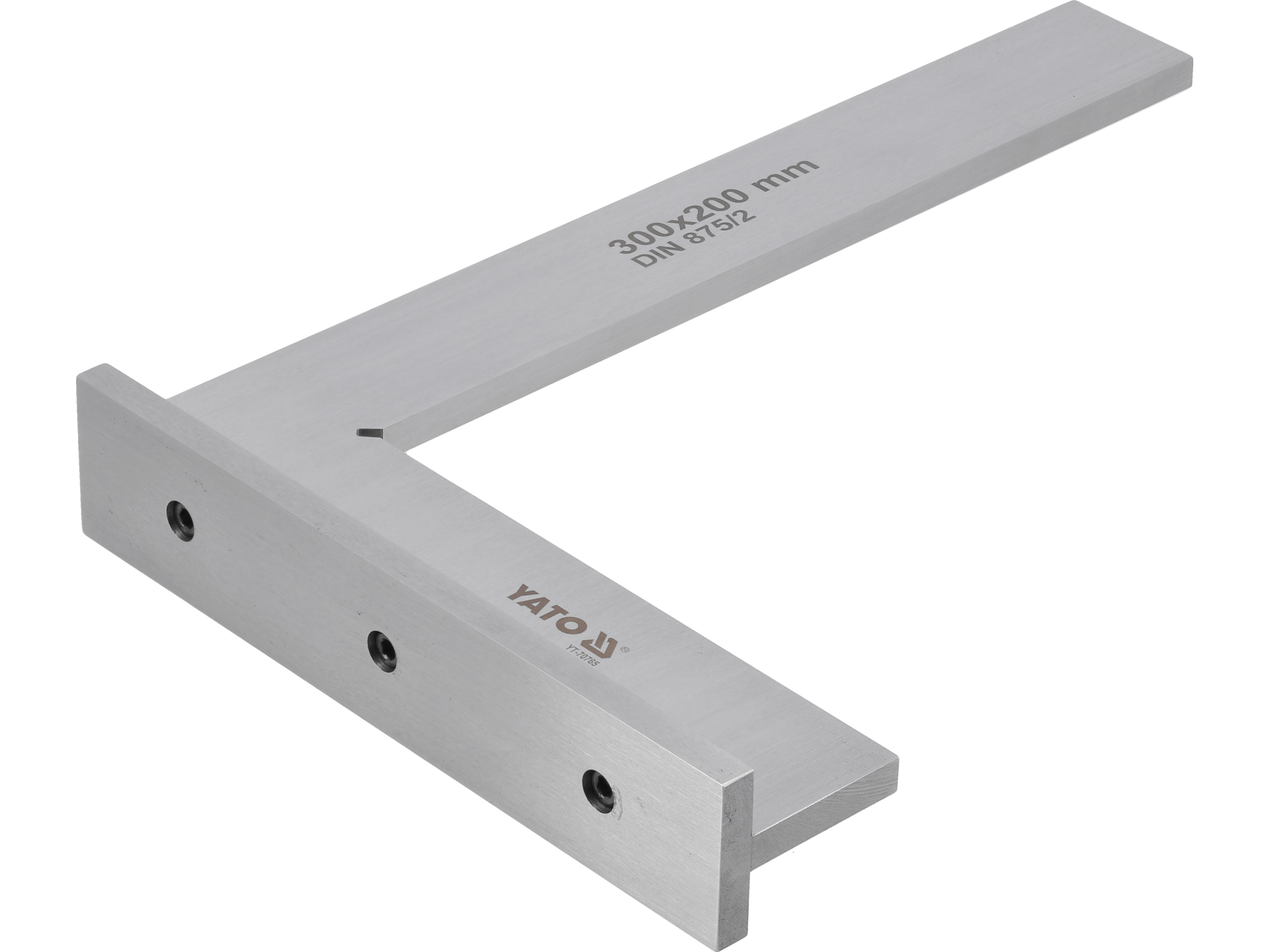Stalowy kątownik pomiarowy ze stopką przeznaczony do precyzyjnego wyznaczania kątów prostych, trasowania linii oraz kontroli prostopadłości elementów w warsztacie ślusarskim, stolarskim i budowlanym.