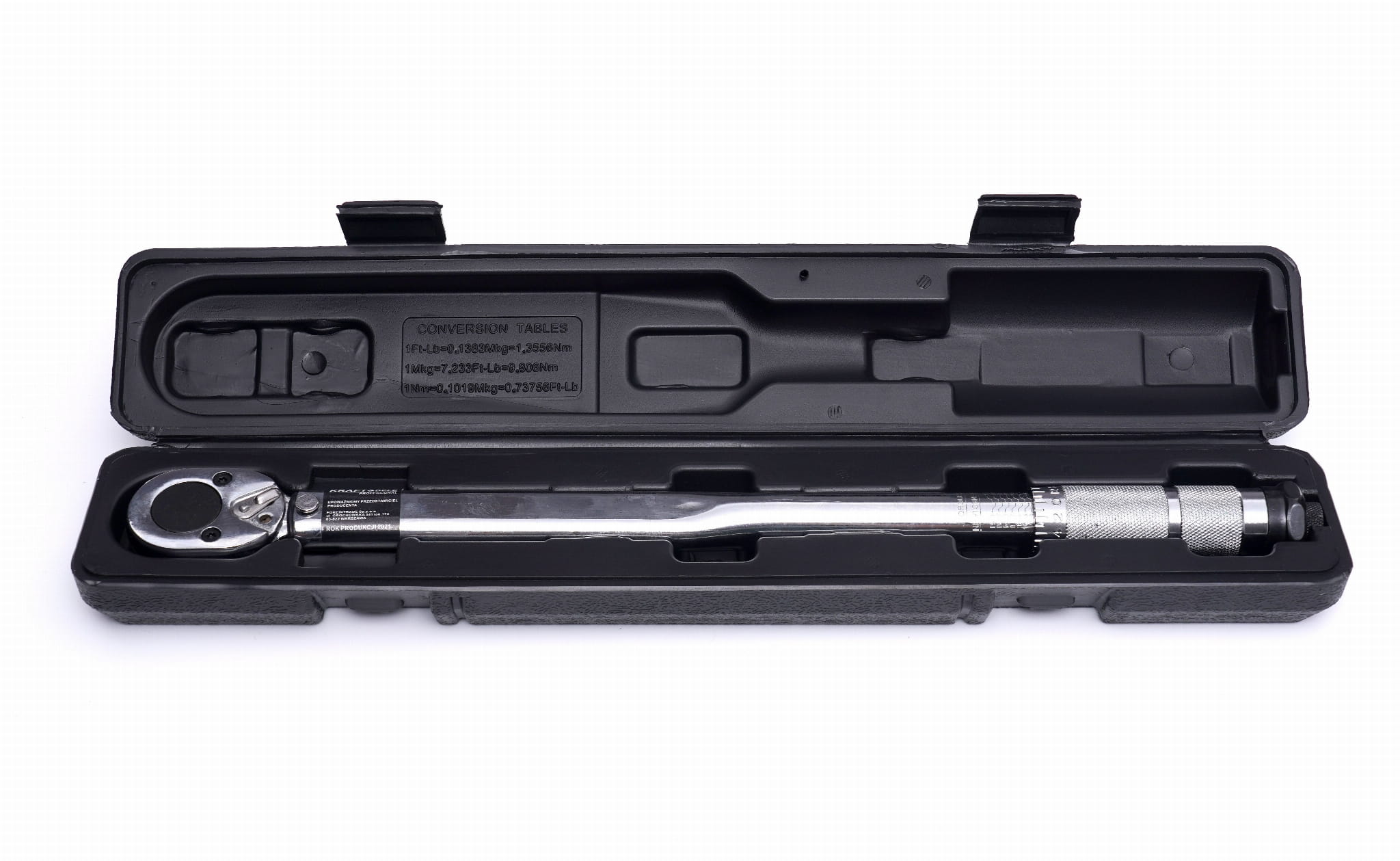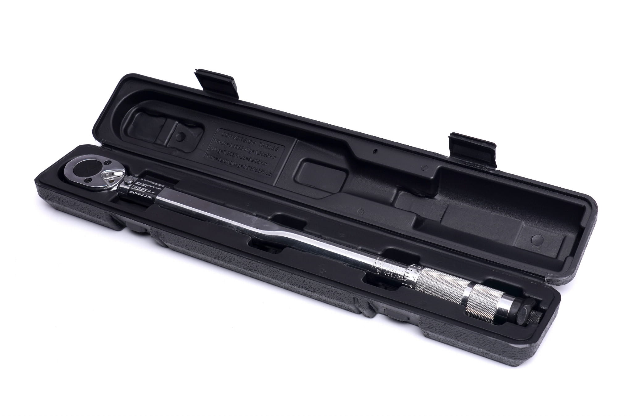 Klucz dostarczany jest w dedykowanej walizce ochronnej (75 x 490 x 68 mm), która zabezpiecza narzędzie przed uszkodzeniami mechanicznymi i zabrudzeniem. Przechowywanie klucza dynamometrycznego w etui z odciążonym mechanizmem (moment ustawiony na minimum) przedłuża żywotność sprężyny i zachowuje dokładność wskazań.