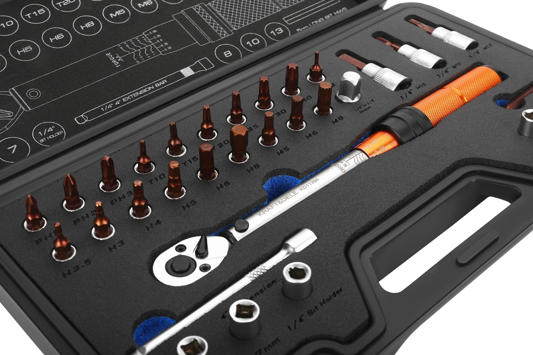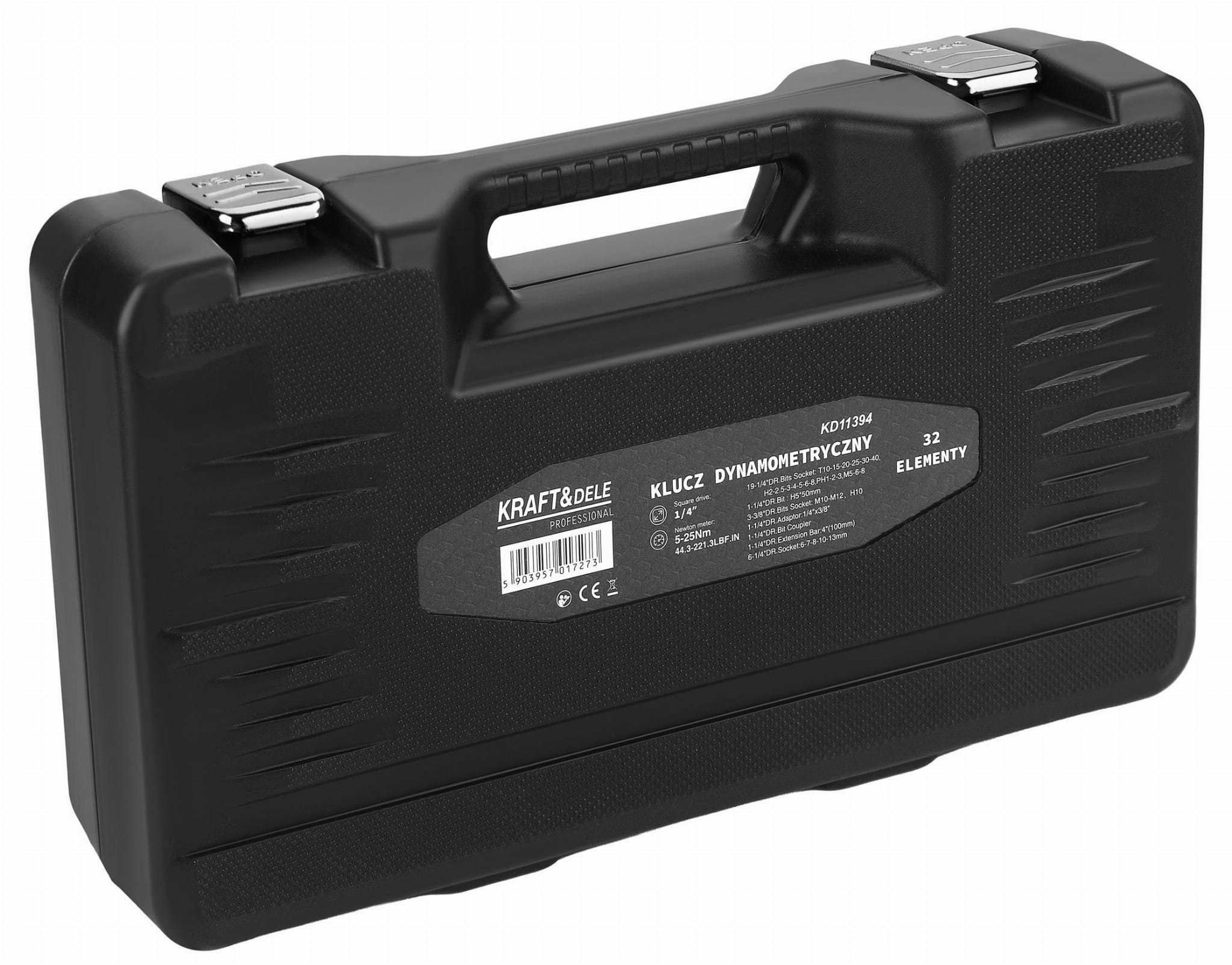 KD11394 to klucz dynamometryczny z napędem 1/4" przeznaczony do precyzyjnego dokręcania połączeń śrubowych z kontrolą momentu obrotowego. Zestaw 32 elementów obejmuje nasadki Torx, sześciokątne, Phillips oraz metryczne, co pozwala na jego zastosowanie przy szerokiej grupie złączy. Całość przechowywana jest w walizce z tworzywa sztucznego ułatwiającej organizację i transport.
