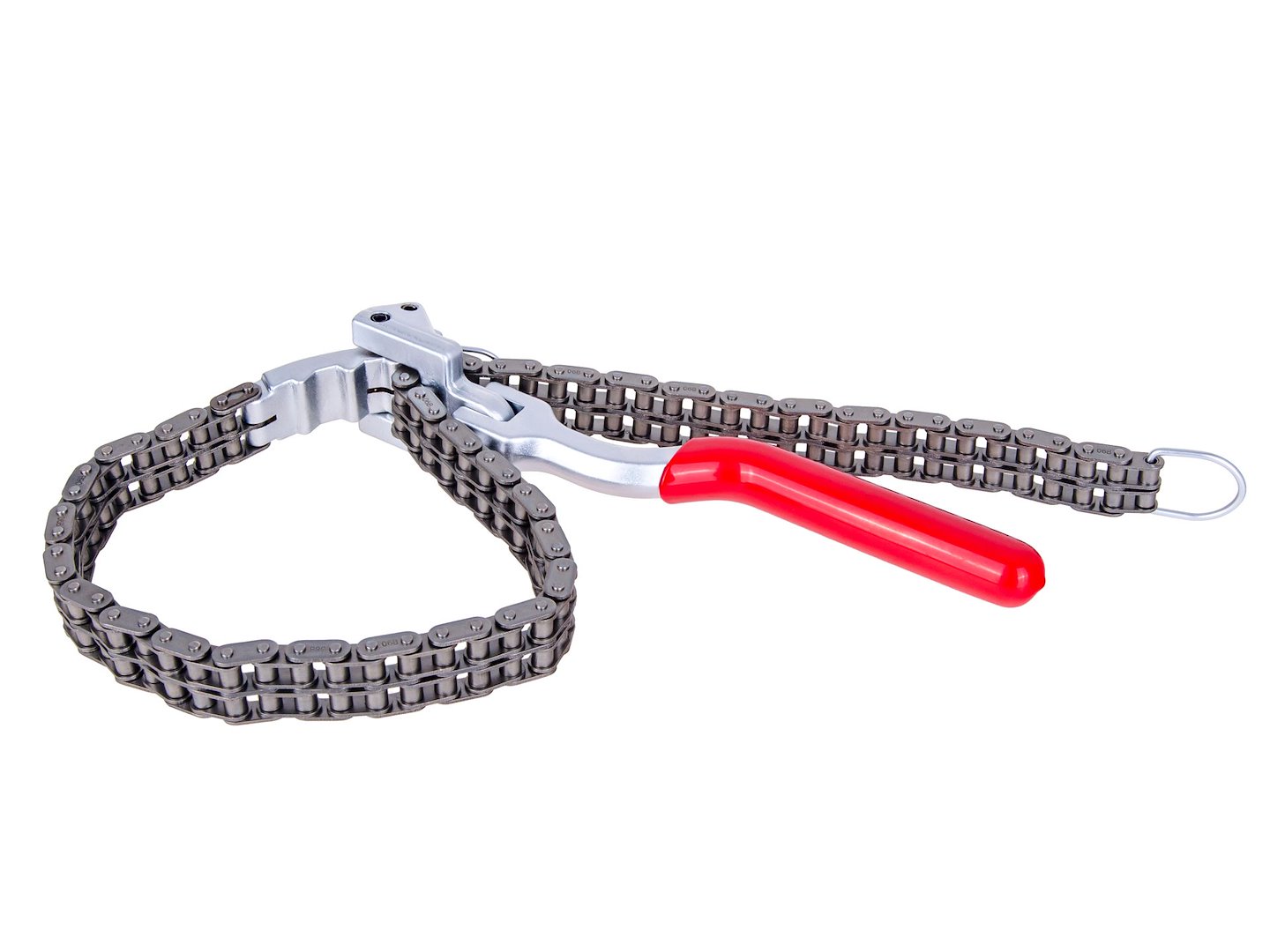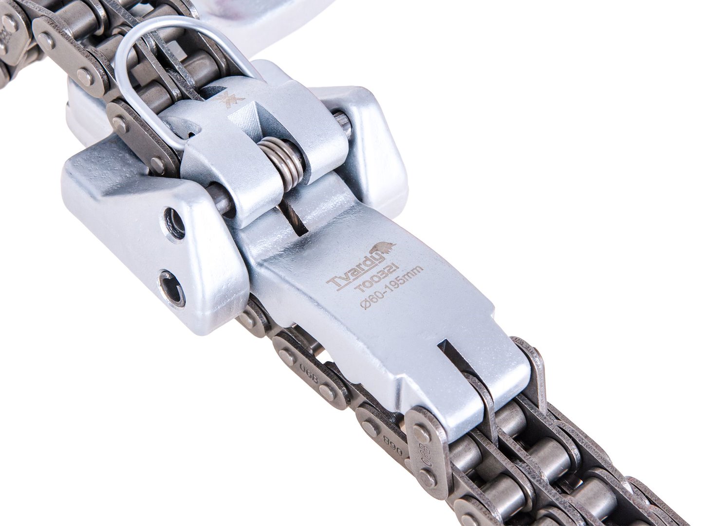 Narzędzie warsztatowe przeznaczone do demontażu filtrów oleju metodą zaciskową — łańcuch owija się wokół obudowy filtra i blokuje ją podczas odkręcania. Zakres pracy 60–195 mm obejmuje większość filtrów stosowanych w samochodach osobowych i dostawczych.