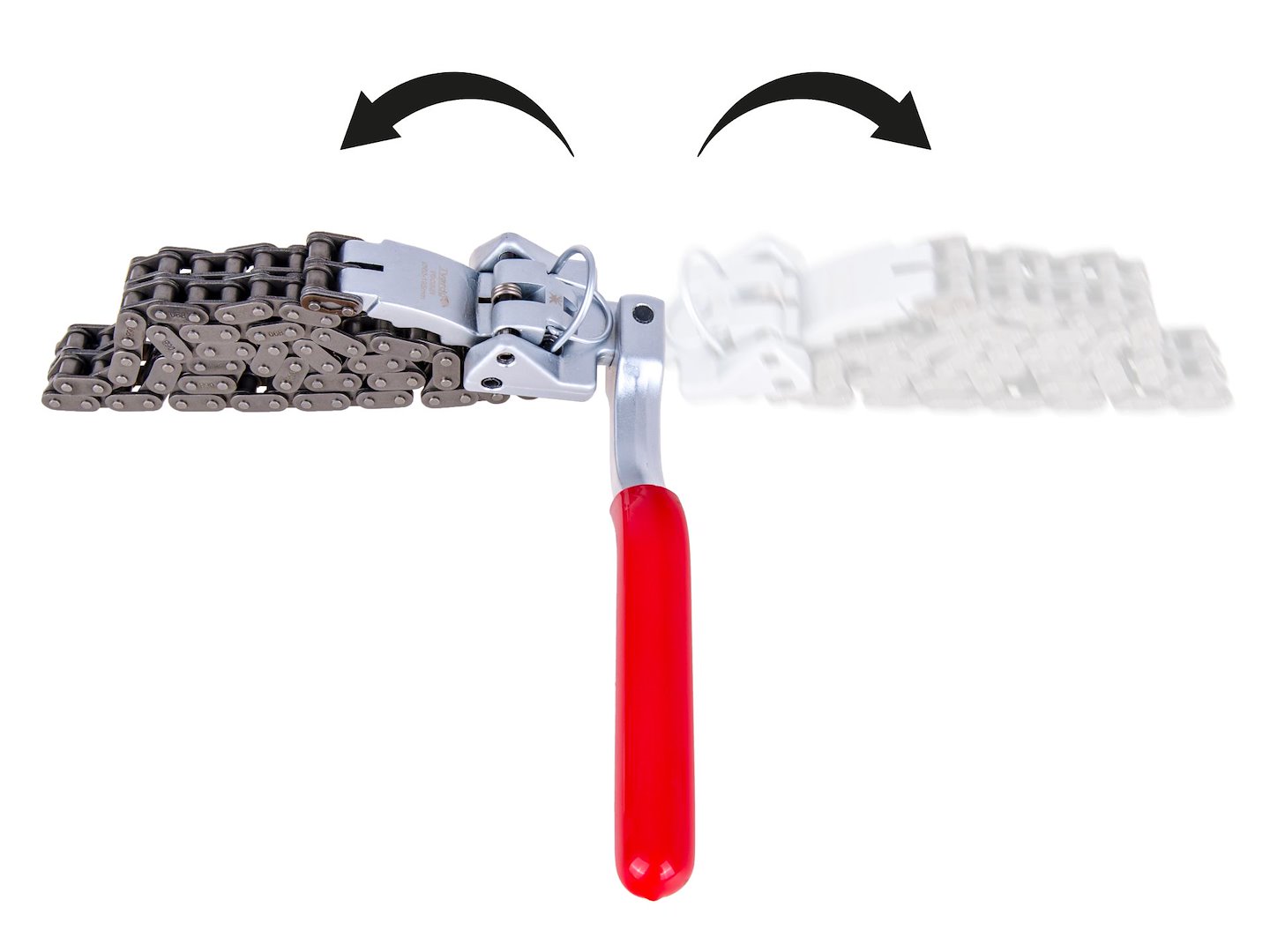 Łańcuch owija się wokół cylindrycznej obudowy filtra, a podczas obrotu rękojeści zacisk samoczynnie się dokręca — im większa siła przyłożona do rękojeści, tym silniejsze trzymanie. Mechanizm ten eliminuje poślizg nawet przy zaolewionych lub silnie zapieczonych filtrach, gdzie klucze taśmowe zawodzą.