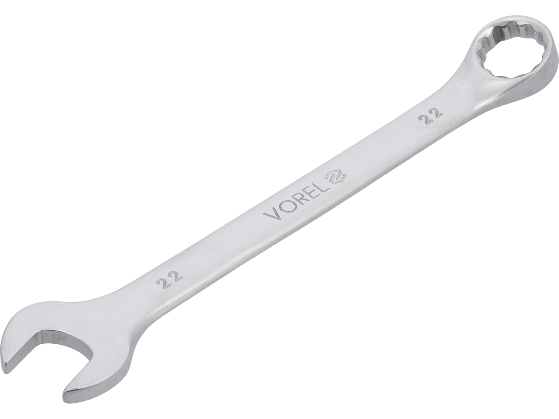 Klucz warsztatowy o rozstawie 22 mm z dwunastokątnym profilem oczkowym i wygięciem pod kątem 15 stopni. Narzędzie ze stali chromowo-wanadowej z satynowym wykończeniem powierzchni, zaprojektowane do prac montażowych i serwisowych w warsztacie oraz terenie.