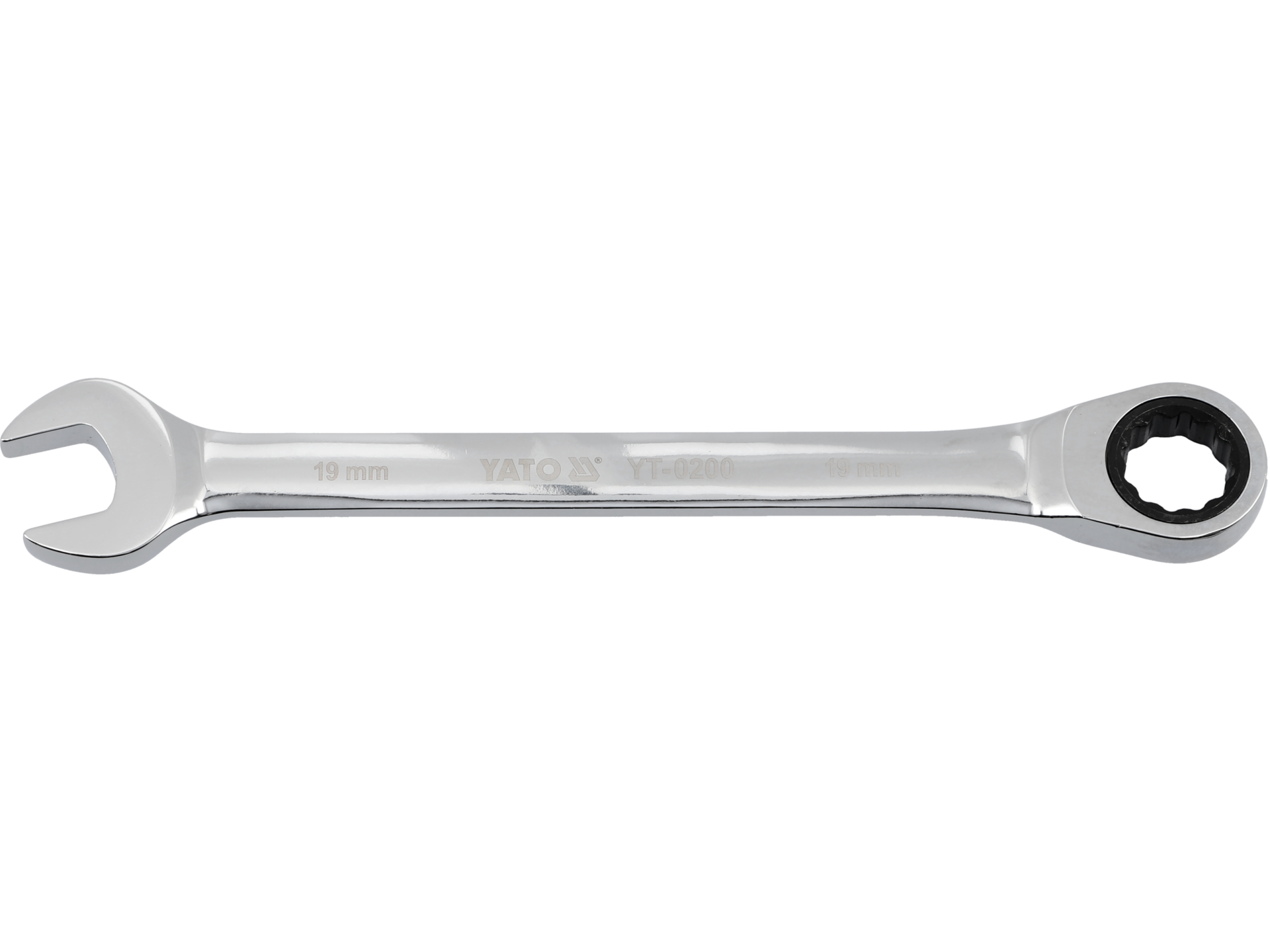 Klucz kombinowany z mechanizmem grzechotki w oczkowej części narzędzia. Rozwiązanie łączące funkcjonalność klucza płaskiego z zaletami grzechotki, przeznaczone do pracy z nakrętkami i śrubami metrycznymi 19 mm.