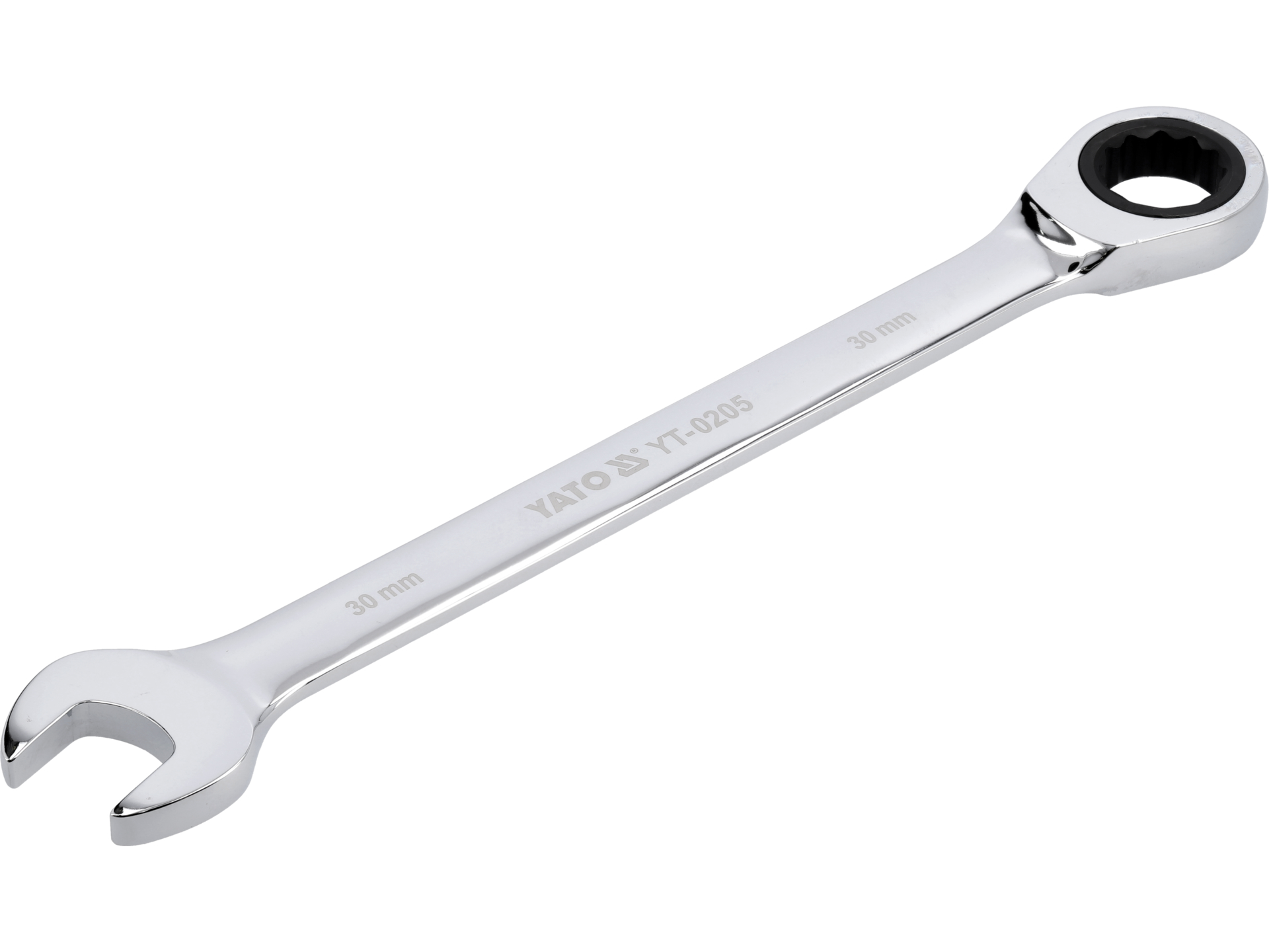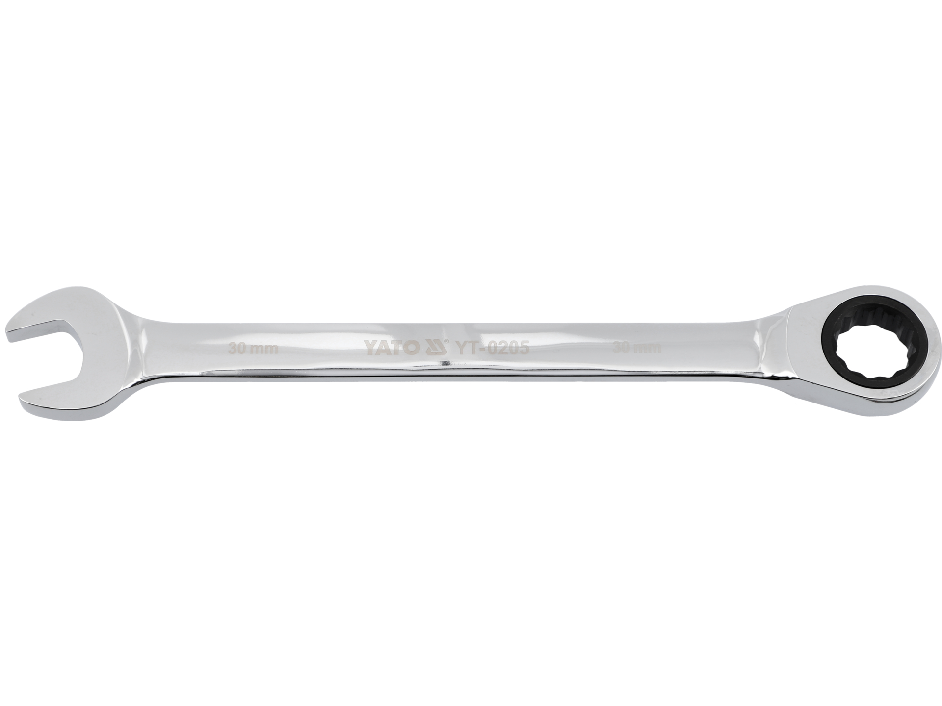 Klucz płasko-oczkowy z grzechotką łączy funkcjonalność klasycznego klucza dwustronnego z mechanizmem grzechotkowym w części oczkowej. Model YT-0205 o rozmiarze 30 mm wykonany ze stali chromowo-wanadowej CrV 6140 przeznaczony jest do prac wymagających dużego momentu obrotowego w ograniczonej przestrzeni roboczej.