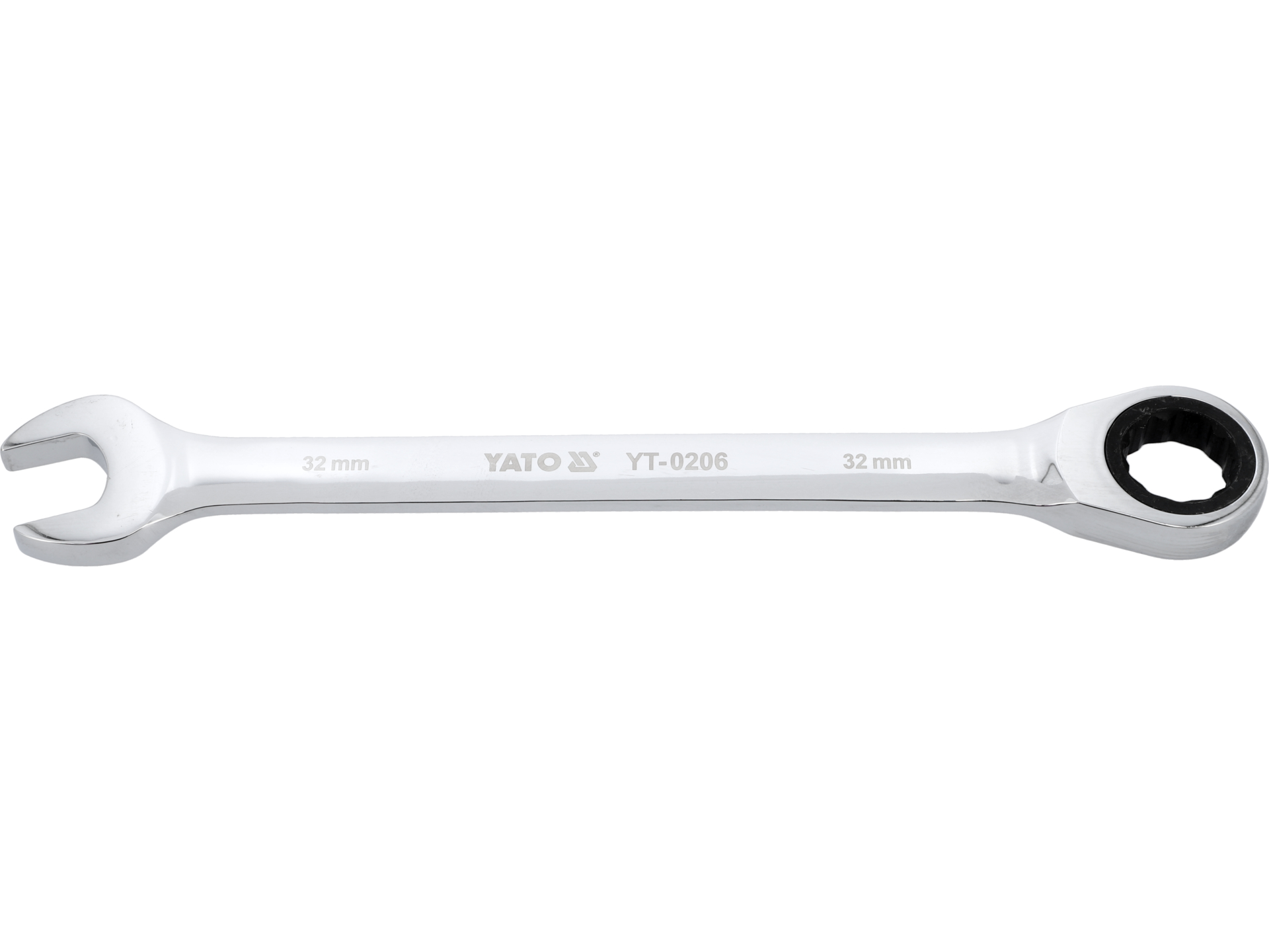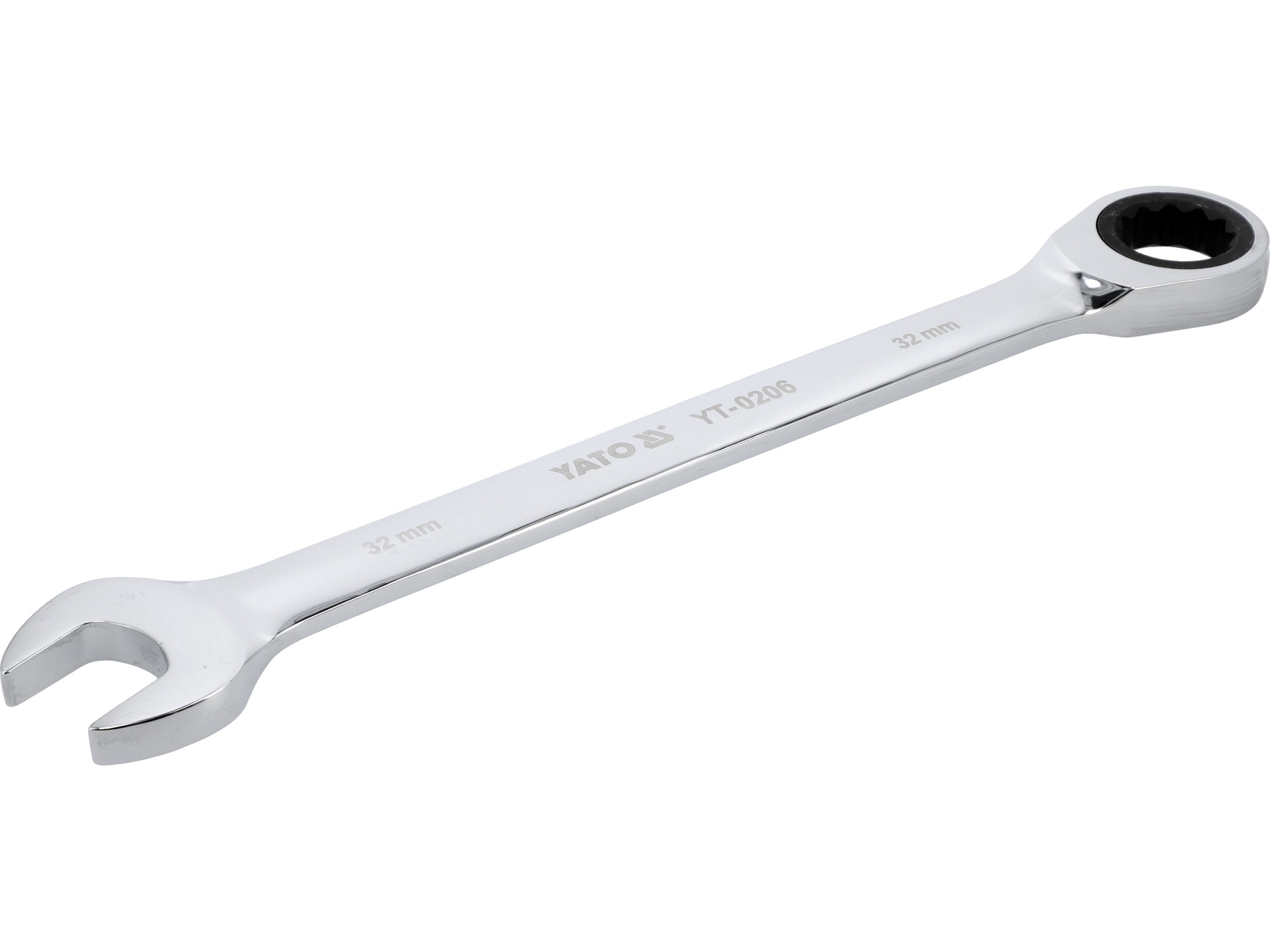 Klucz płasko-oczkowy z grzechotką 32 mm marki YATO łączy funkcjonalność dwóch narzędzi w jednym korpusie. Wykonany ze stali narzędziowej CrV 6140, wyposażony w mechanizm grzechotkowy 72-zębowy i oczko 12-kątne, umożliwia pracę w ograniczonej przestrzeni z minimalnym kątem obrotu 5°.