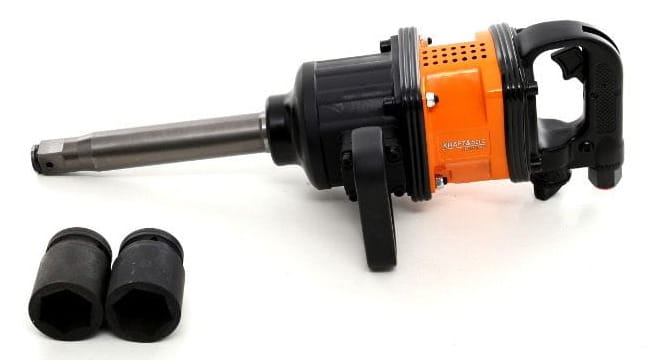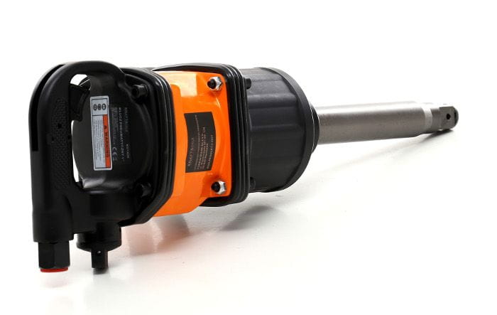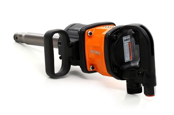 Kwadratowy napęd 1-calowy to standard stosowany w narzędziach przeznaczonych do pojazdów ciężarowych i autobusów. Wymaga nasadek z gniazdem 1". W zestawie dołączone są nasadki 38 mm i 41 mm — rozmiary typowe dla śrub kół pojazdów ciężkich.