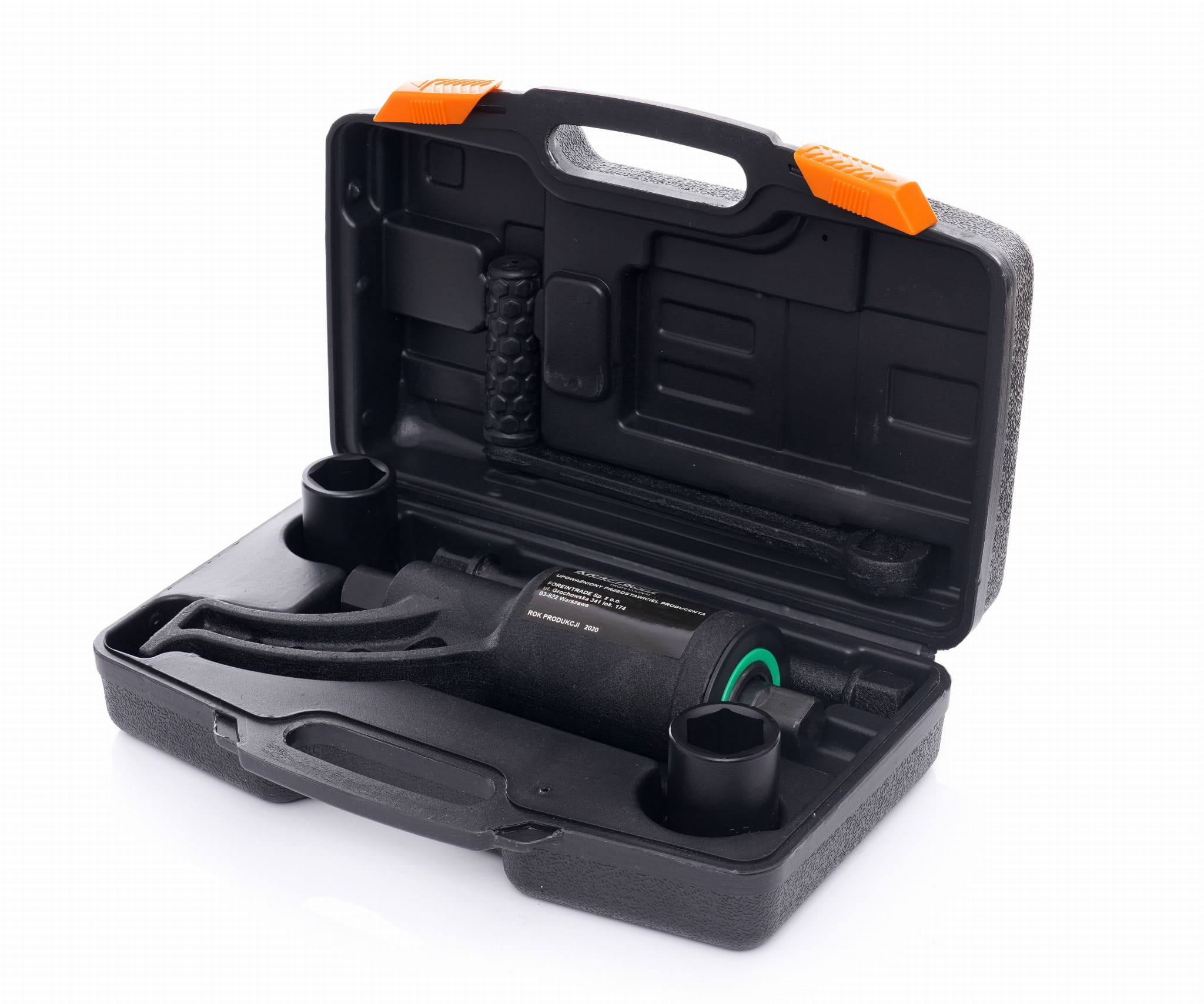 Zestaw zawiera przedłużkę umożliwiającą szybkie odkręcanie śruby po jej wstępnym poluzowaniu kluczem, co skraca czas wymiany koła. Walizka transportowa chroni elementy zestawu przed uszkodzeniem i ułatwia kompletowanie narzędzi po zakończeniu pracy.