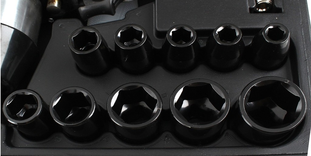 Klucz udarowy pneumatyczny KD1420 jest dostarczany z nasadkami, olejarką, złączką i walizką, co ułatwia organizację pracy i transport.