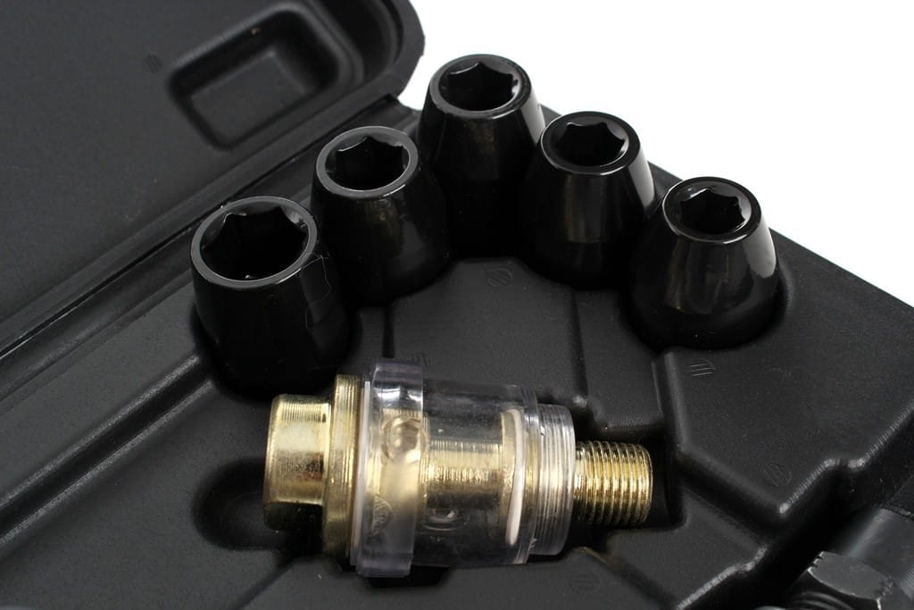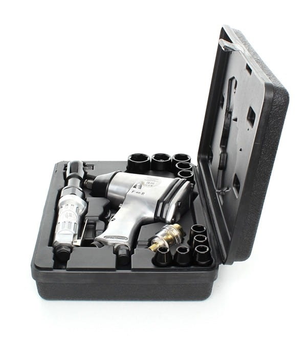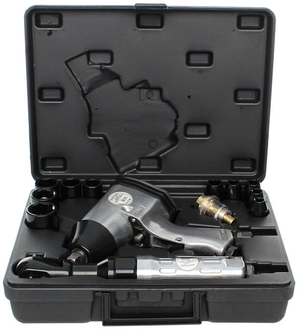 Klucz udarowy wymaga przepływu powietrza ok. 350 l/min przy maksymalnym momencie i węża o wewnętrznym przekroju min. 9 mm. Grzechotka pracuje przy zużyciu ok. 310 l/min i węża o przekroju min. 6 mm. Przed zakupem należy sprawdzić, czy posiadany kompresor zapewnia wymagany przepływ powietrza — zbyt mała wydajność sprężarki skutkuje obniżeniem momentu obrotowego narzędzia.