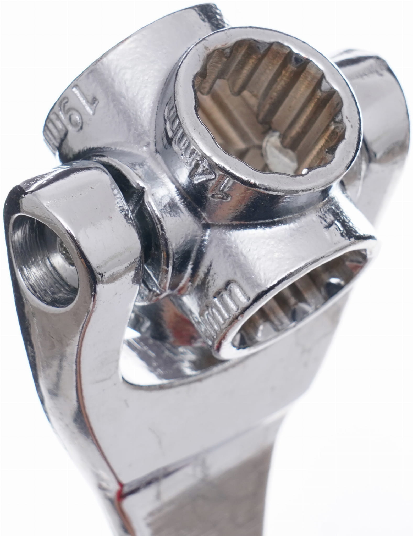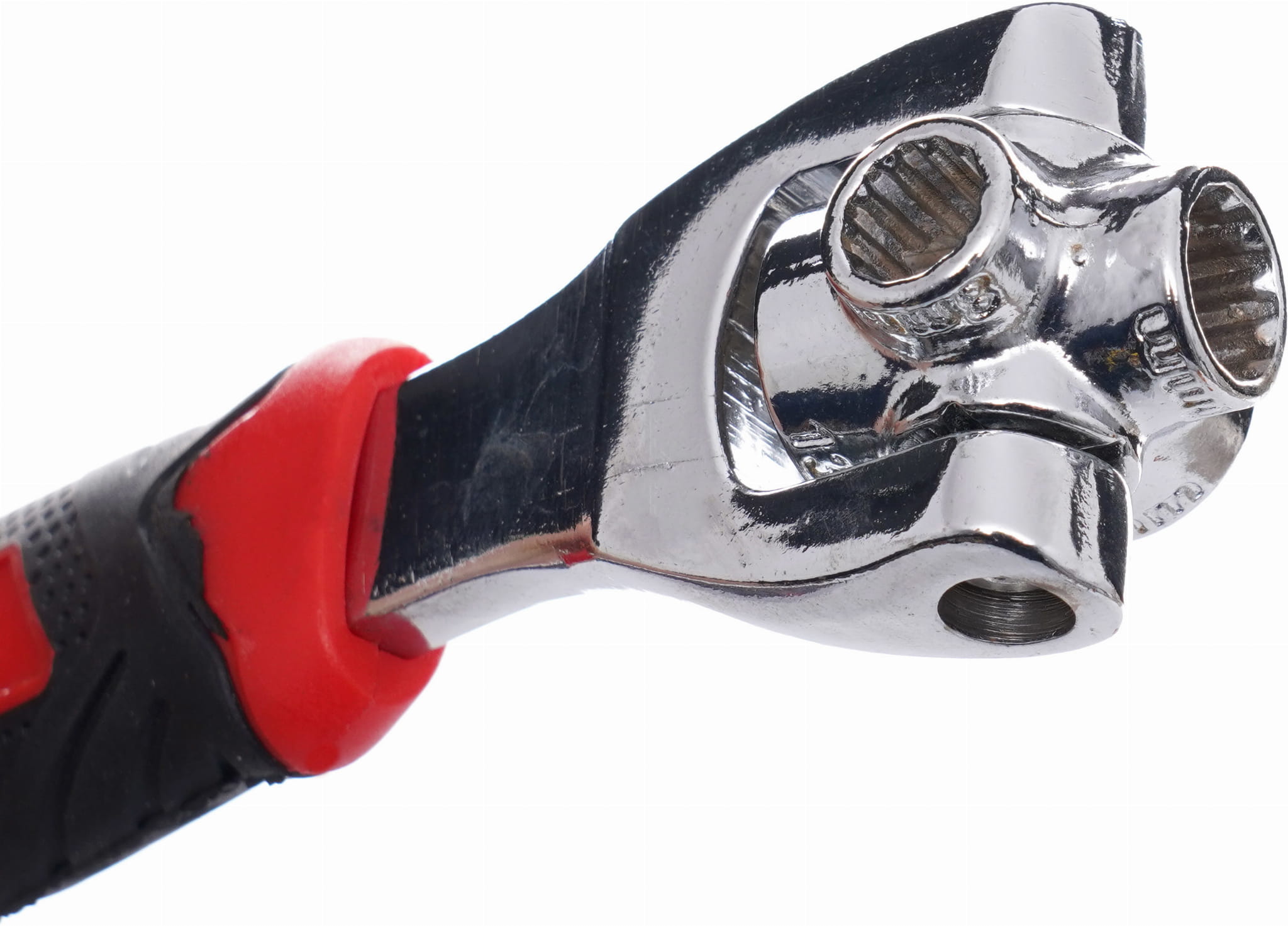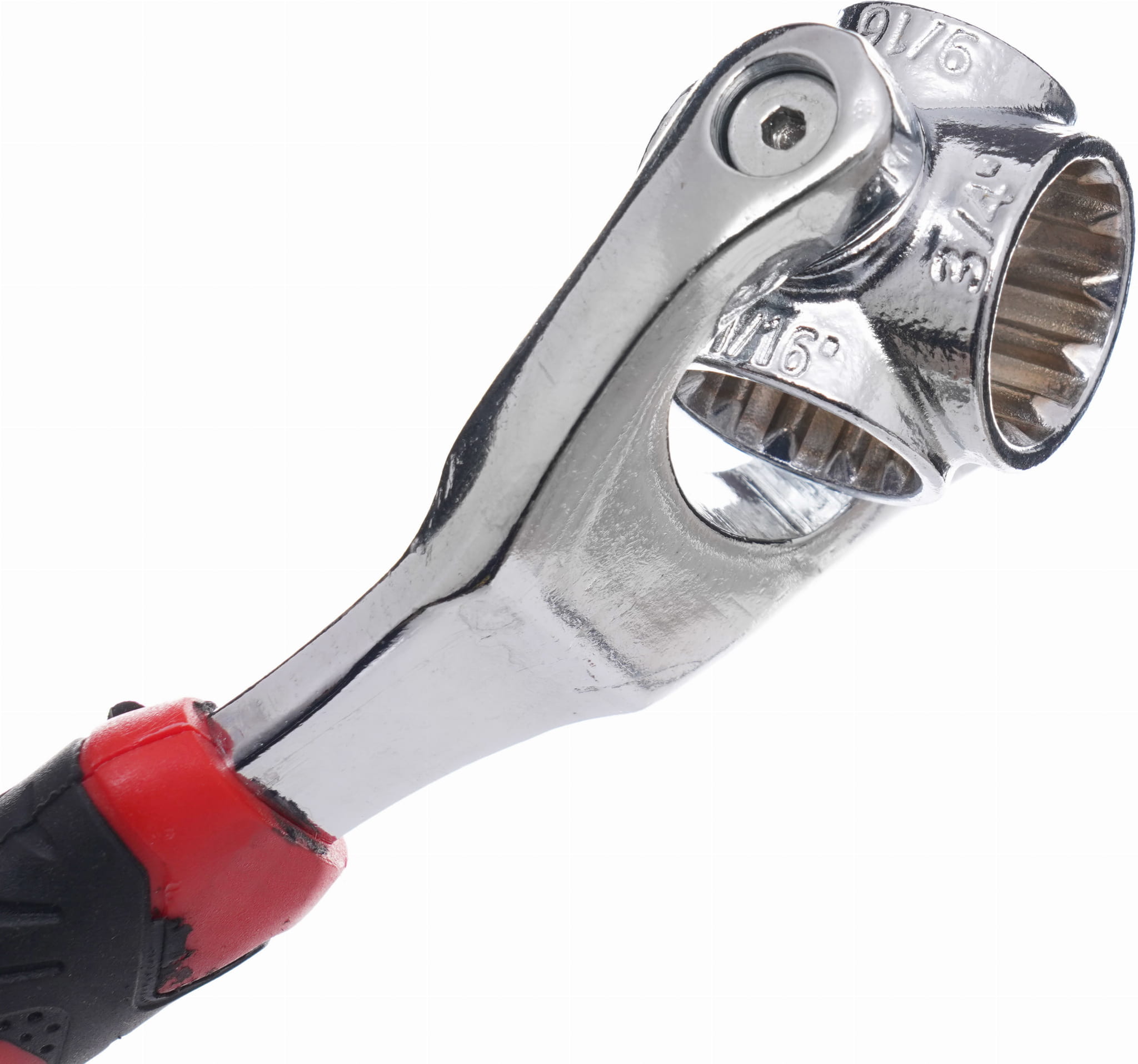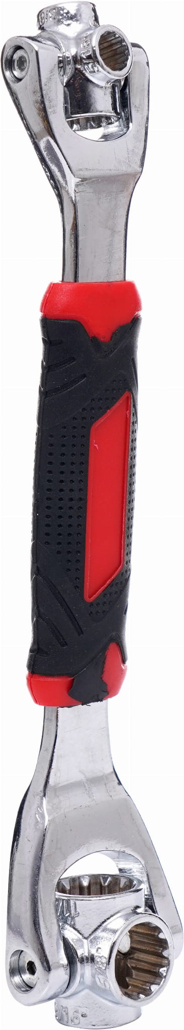 Każdy koniec klucza wyposażono w niezależną głowicę, która obraca się swobodnie wokół własnej osi. Mechanizm samoczynnie centruje się na łbie śruby, dzięki czemu nie trzeba szukać właściwego klucza przed każdym dokręceniem — wystarczy przyłożyć narzędzie i rozpocząć pracę.