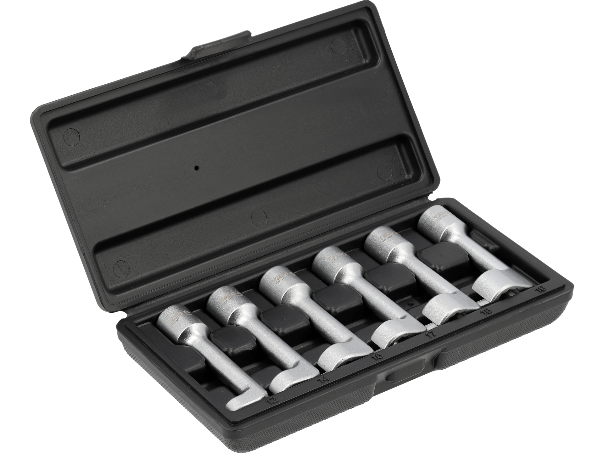 Komplet obejmuje rozmiary 12, 14, 16, 17, 18 i 19 mm, co odpowiada standardom nakrętek stosowanych w układach Common Rail, pompach wtryskowych oraz przewodach łączących wtryskiwacze z szyną paliwową w większości samochodów osobowych i dostawczych z silnikami diesla.