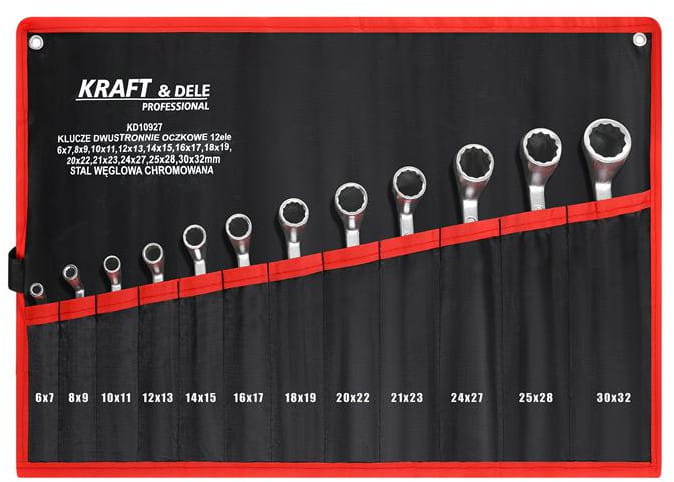 Zestaw 12 kluczy dwustronnie oczkowych wykonanych ze stali węglowej chromowanej, obejmujący rozmiary od 6 do 32 mm. Klucz oczkowy w odróżnieniu od płaskiego obejmuje nakrętkę lub łeb śruby pełnym pierścieniem, co eliminuje ryzyko ześlizgnięcia się narzędzia i pozwala przenosić większy moment obrotowy bez uszkodzenia krawędzi łącznika.