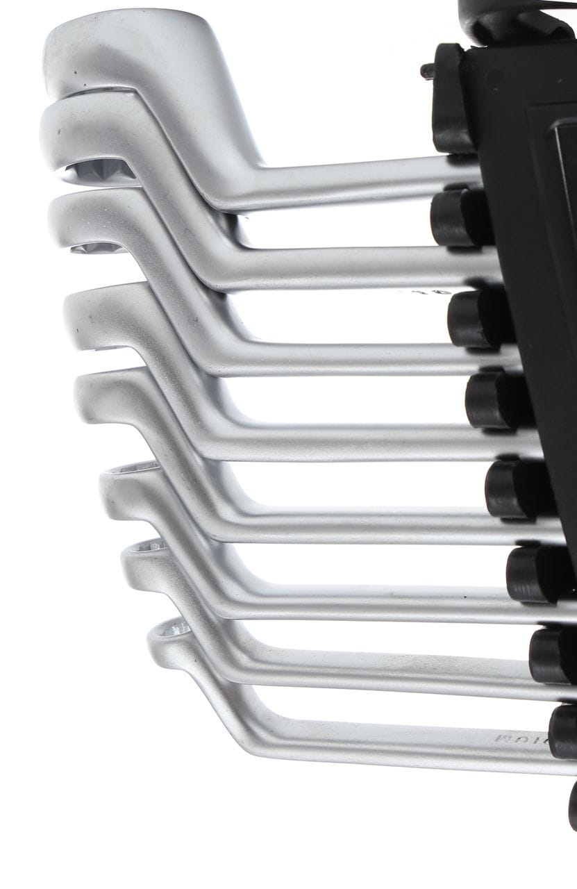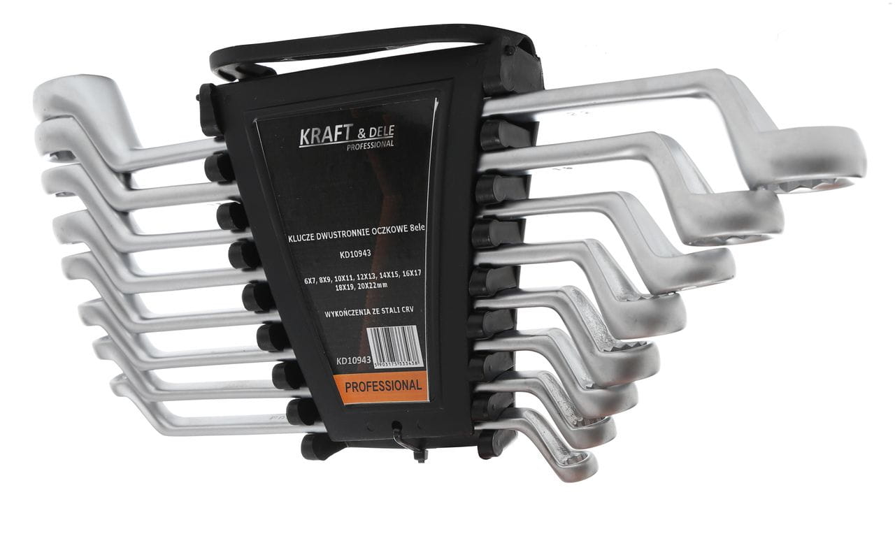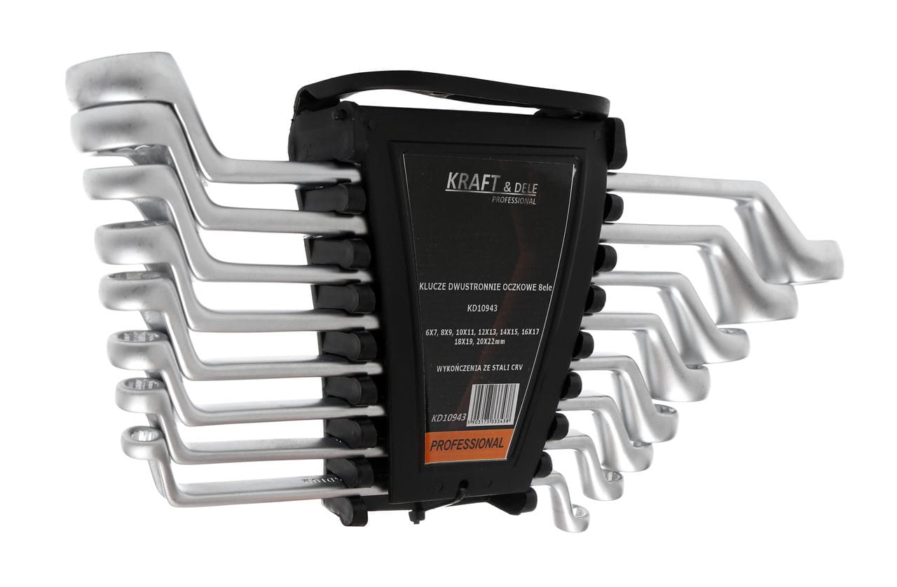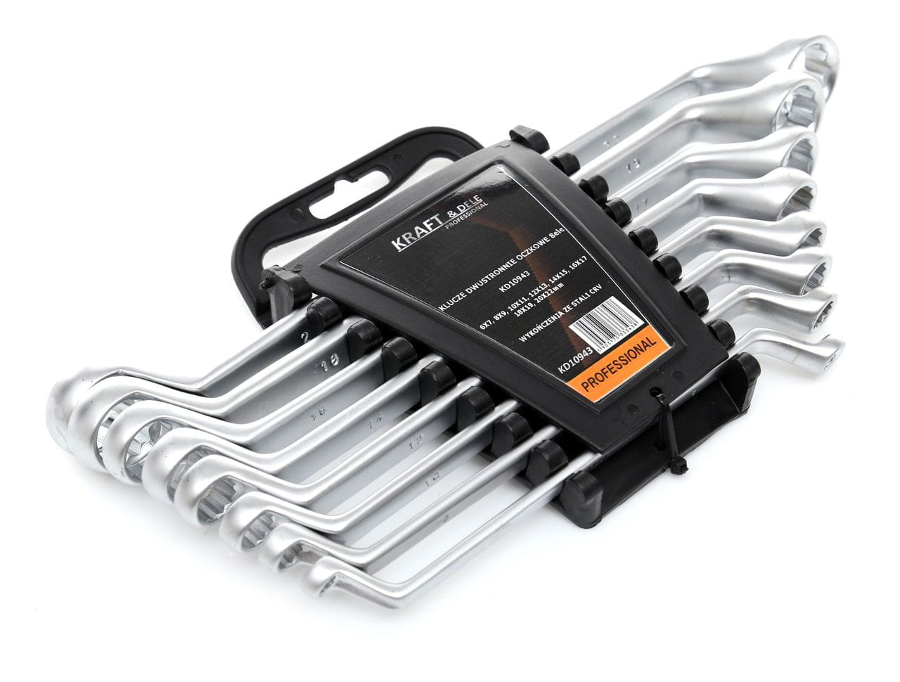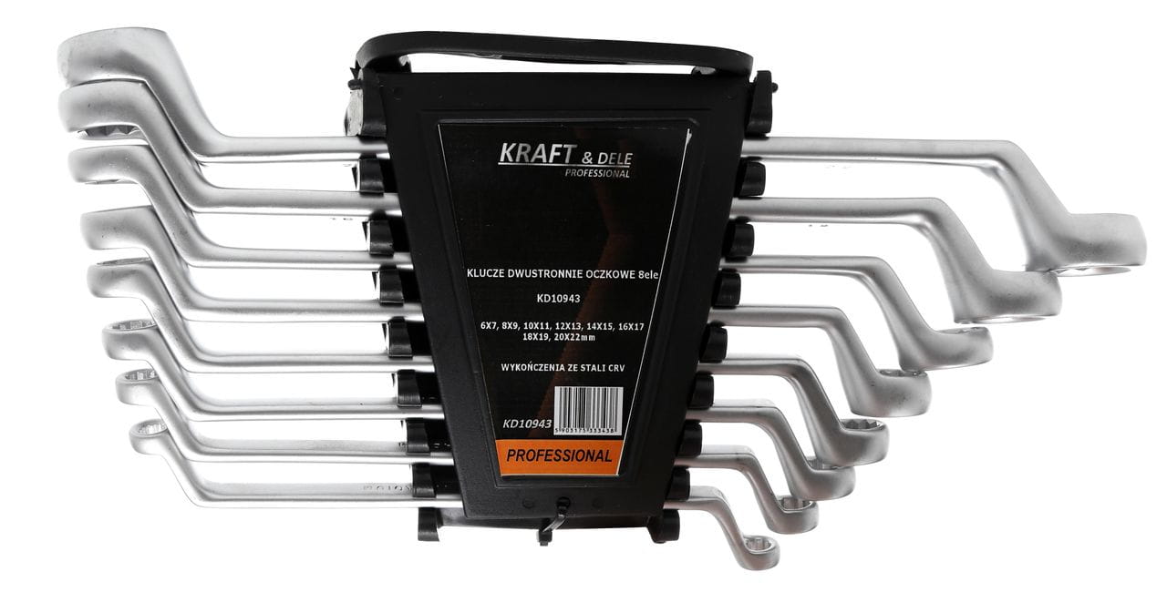 Zestaw ośmiu kluczy dwustronnie oczkowych wykonanych ze stali chromowo-wanadowej (CrV). Każdy klucz posiada dwa oczka o różnych rozmiarach, co pozwala obsłużyć szerokie spektrum śrub i nakrętek bez konieczności zmiany narzędzia. Zestaw pokrywa rozmiary od 6 do 22 mm.