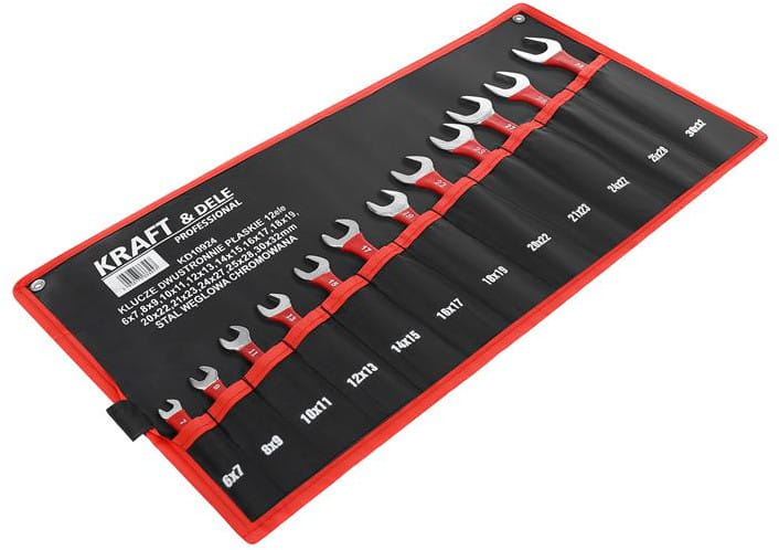 Zestaw 12 kluczy płaskich dwustronnych wykonanych ze stali węglowej chromowanej, obejmujący rozmiary od 6×7 do 30×32 mm. Konstrukcja dwustronna pozwala na obsługę dwóch rozmiarów jednym narzędziem, co ogranicza liczbę kluczy potrzebnych podczas pracy.