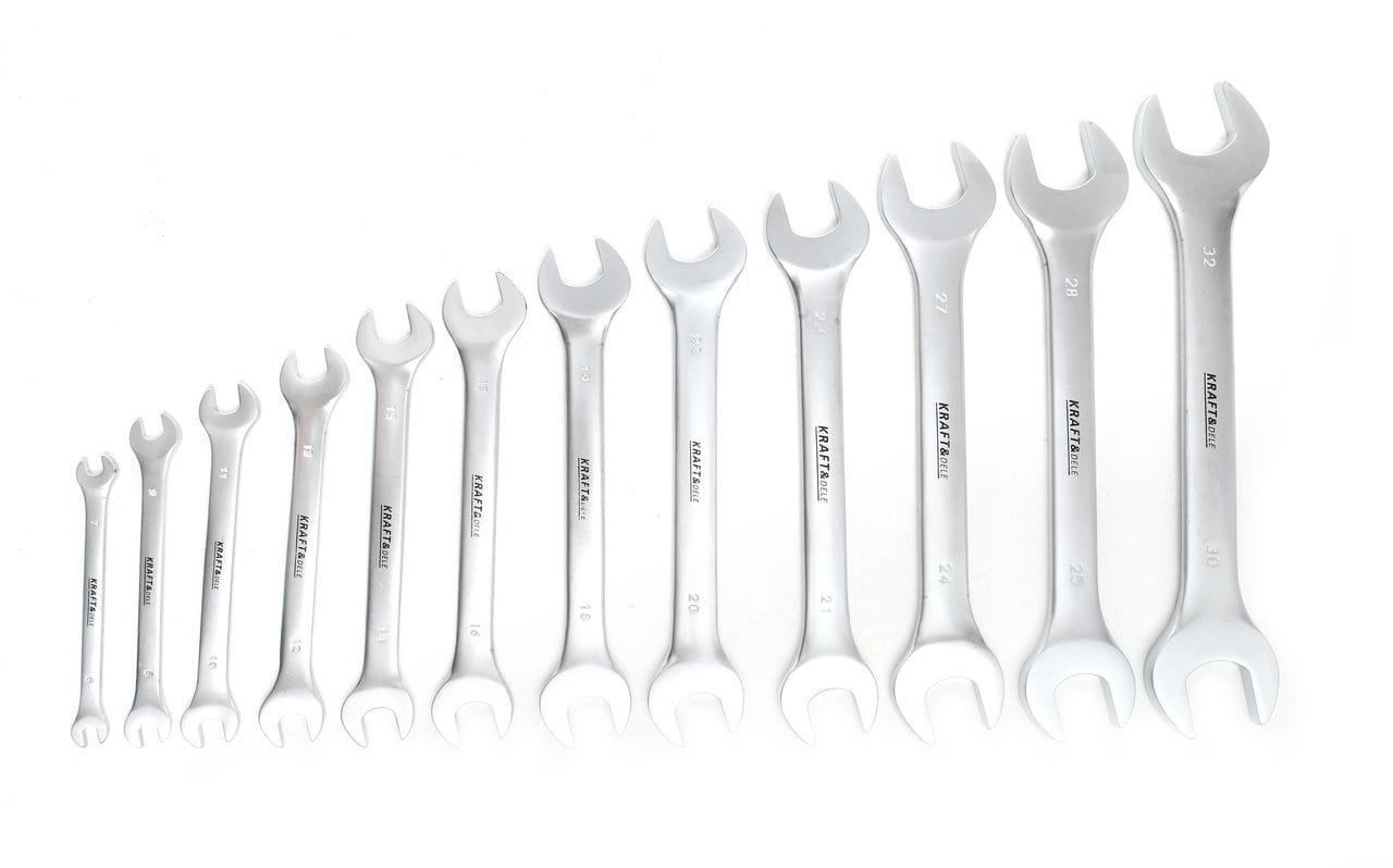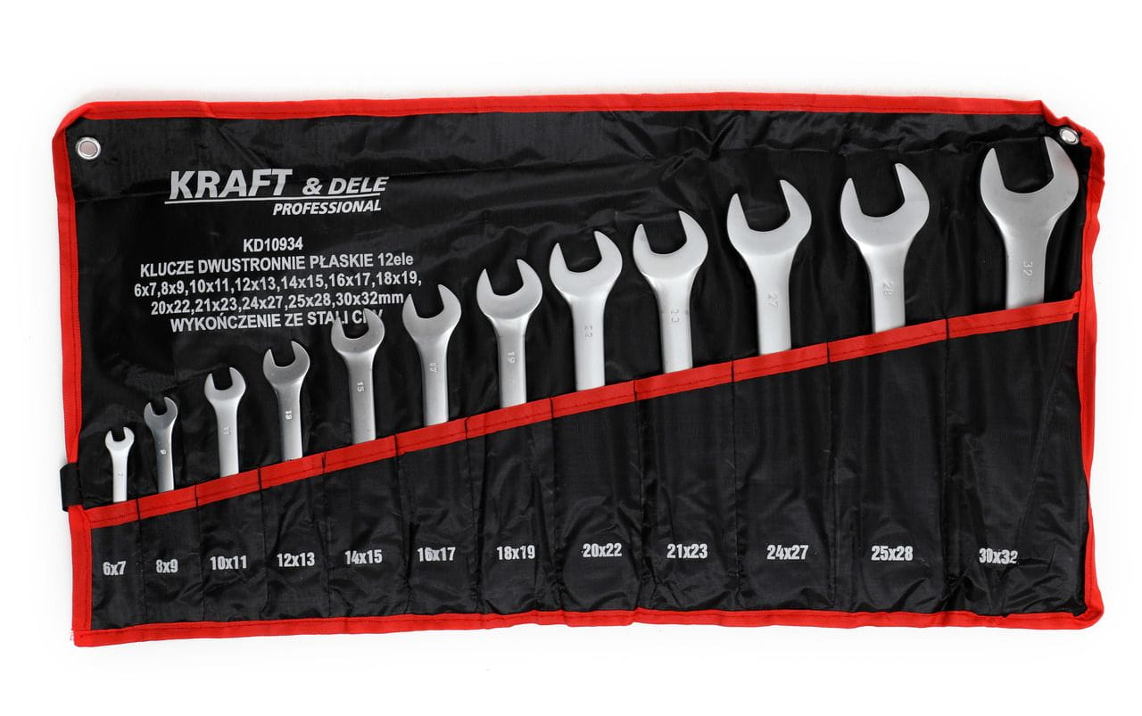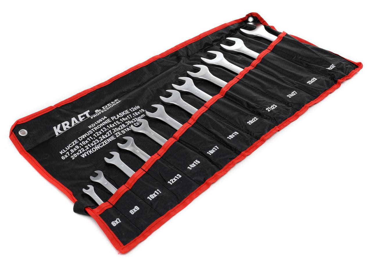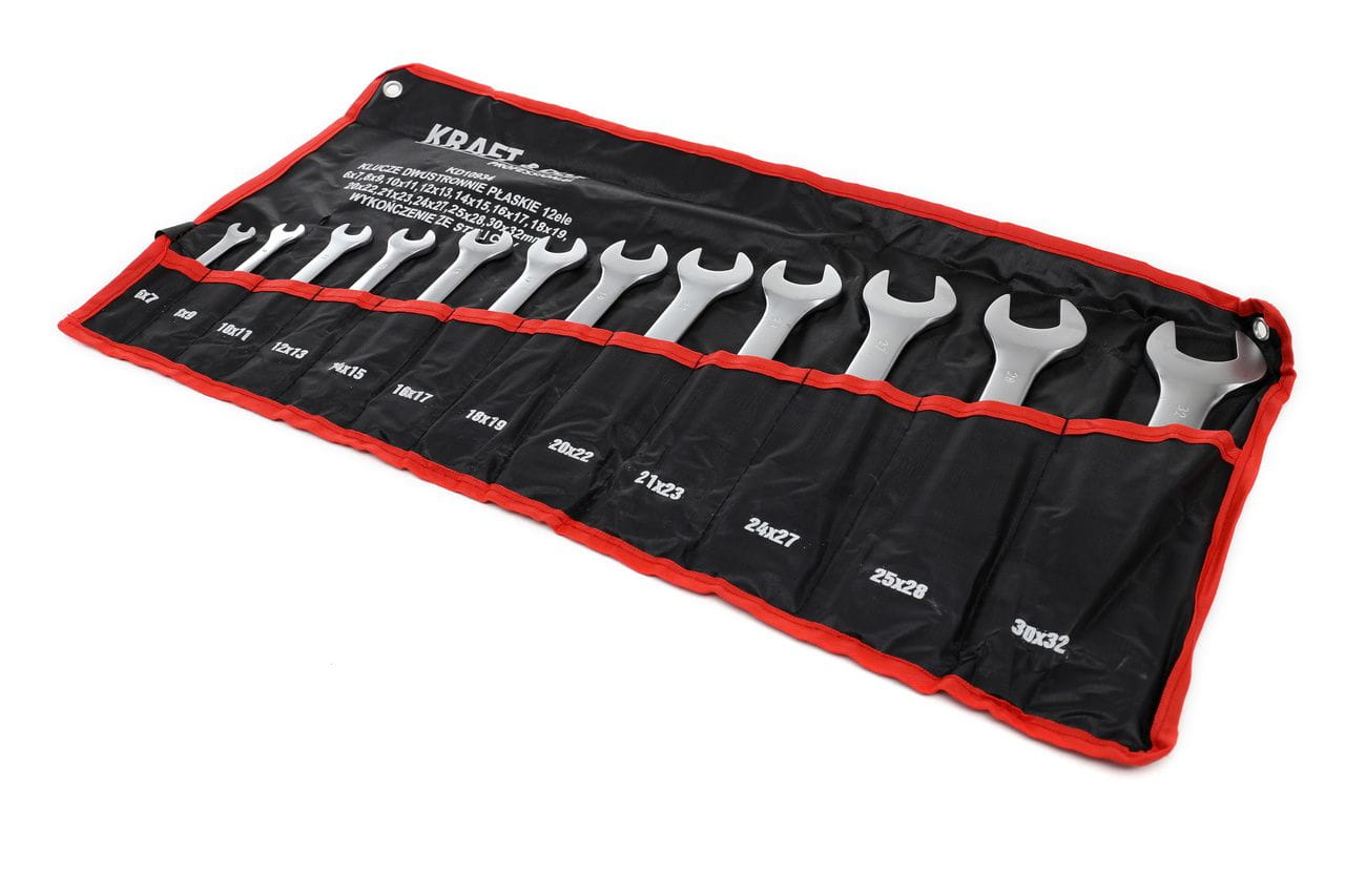 Zestaw 12 kluczy płaskich dwustronnych wykonanych ze stali chromowo-wanadowej (CrV), obejmujący rozmiary od 6×7 do 30×32 mm. Konstrukcja dwustronna pozwala na obsługę dwóch rozmiarów jednym narzędziem, co ogranicza liczbę kluczy potrzebnych w zestawie i skraca czas szukania właściwego rozmiaru podczas pracy.