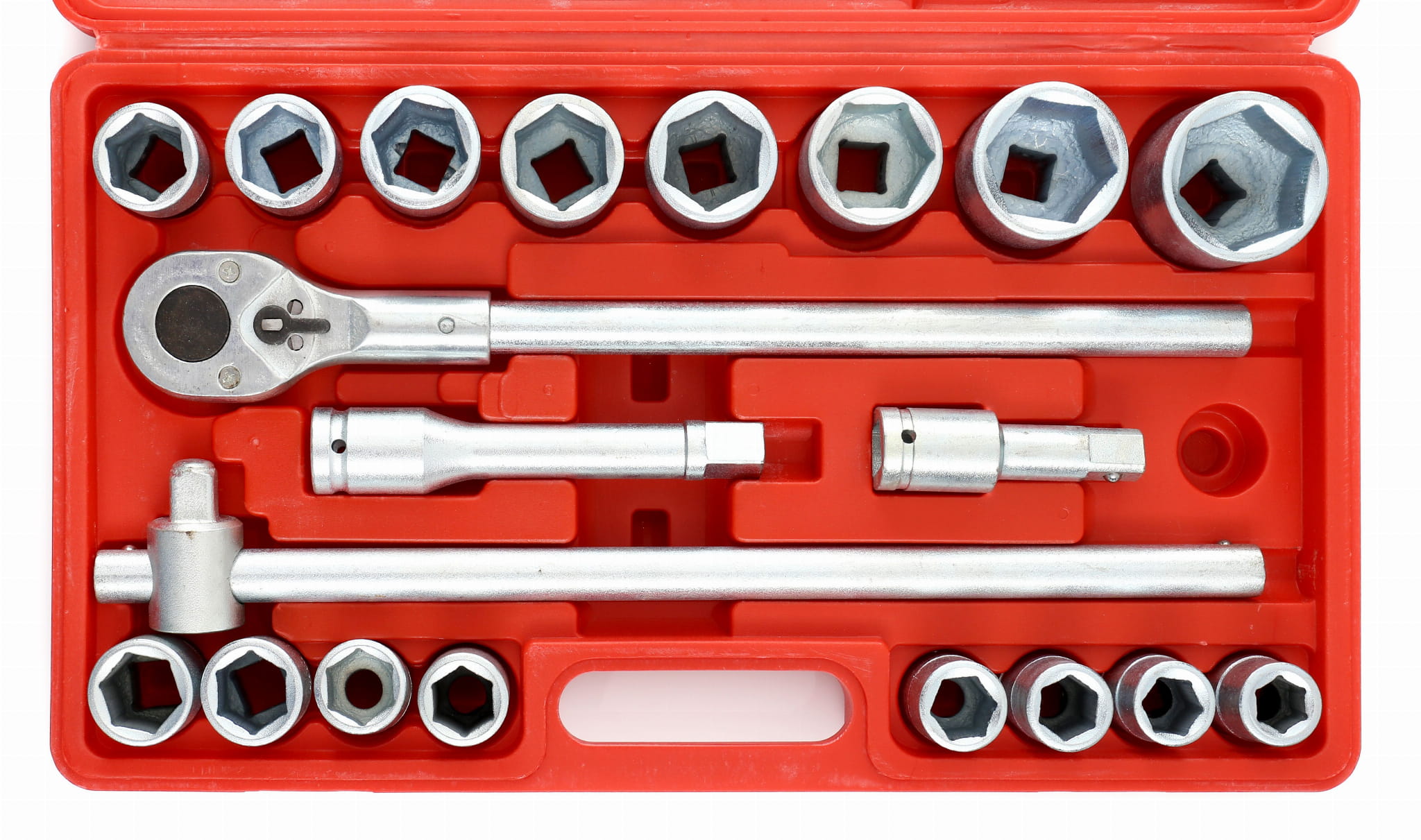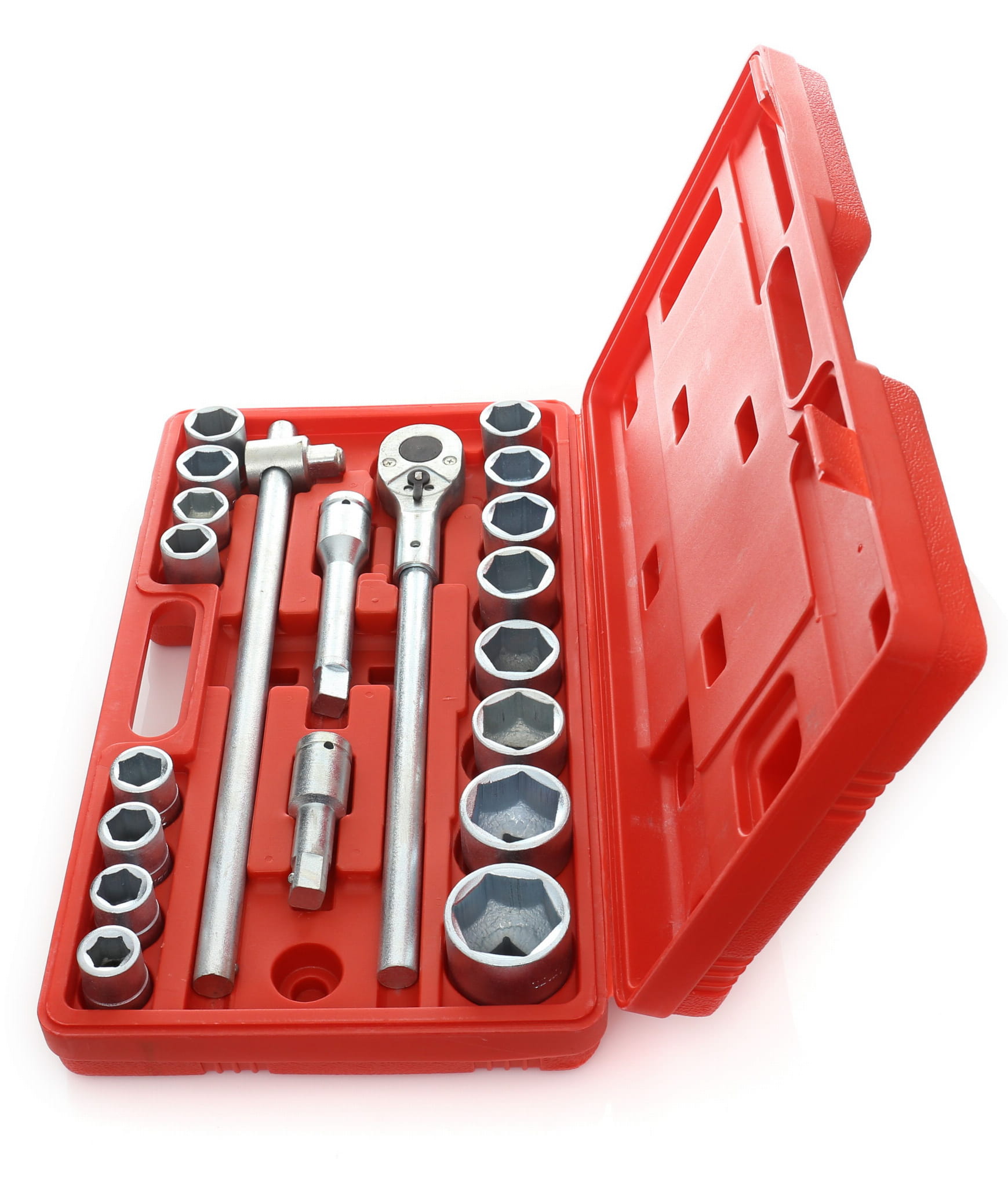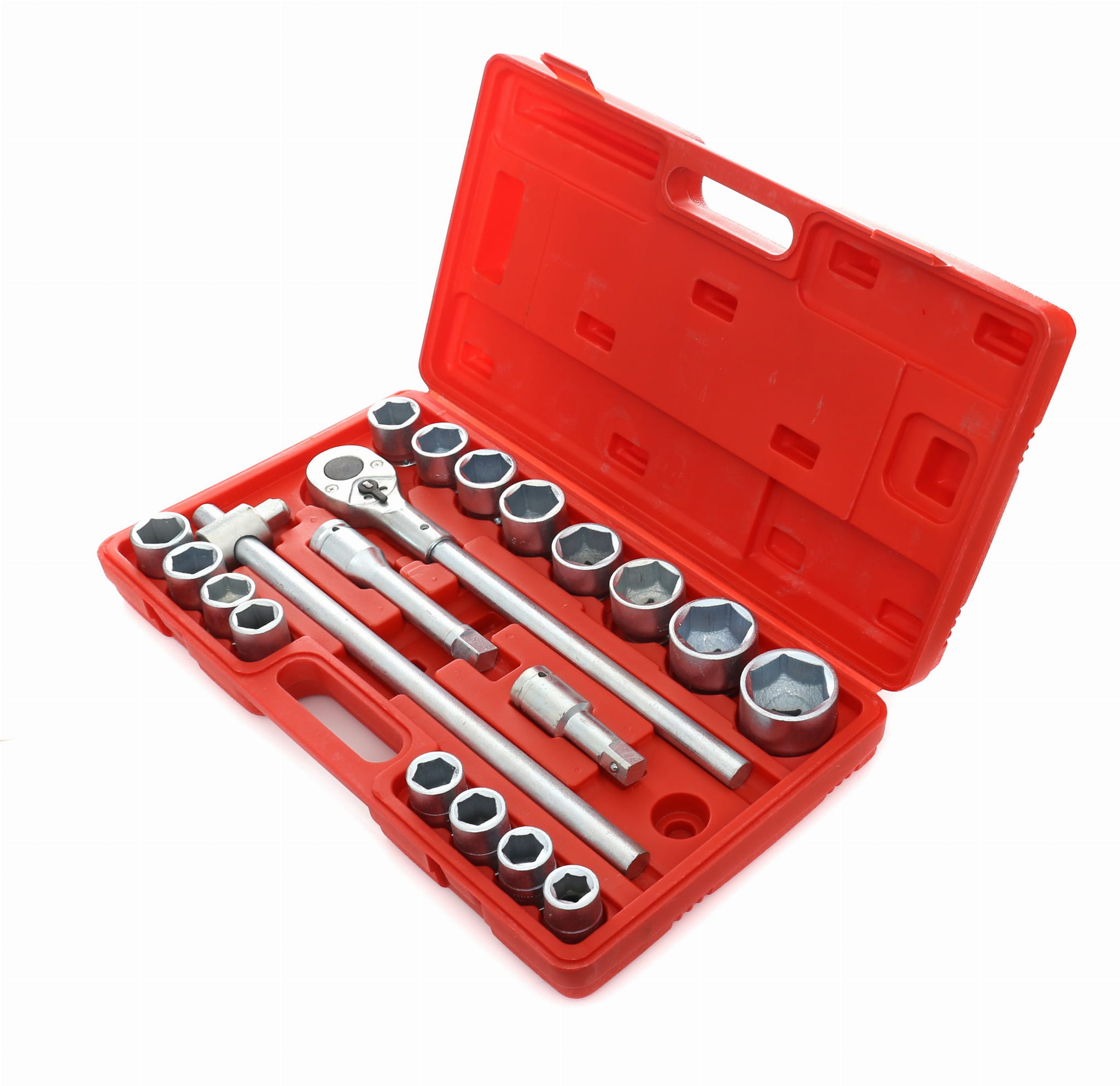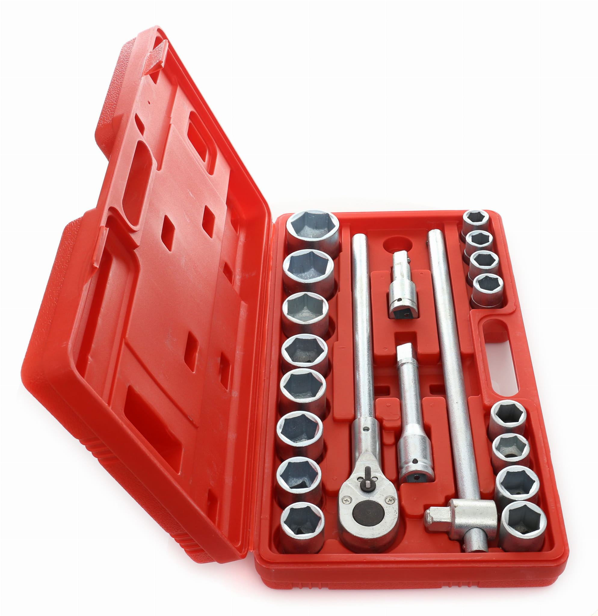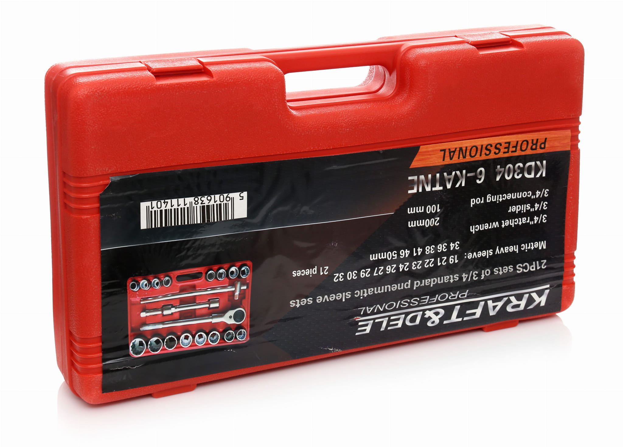 KD304 to zestaw kluczy nasadowych z kwadratem napędowym 3/4 cala, przeznaczony do pracy przy dużych połączeniach śrubowych w warsztacie, serwisie maszyn i montażu konstrukcyjnym. Zestaw obejmuje 16 nasadek sześciokątnych w zakresie 19–50 mm, dźwignię przesuwną oraz dwa przedłużenia — wszystko w walizce transportowej.