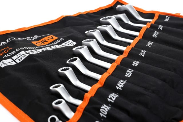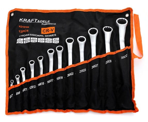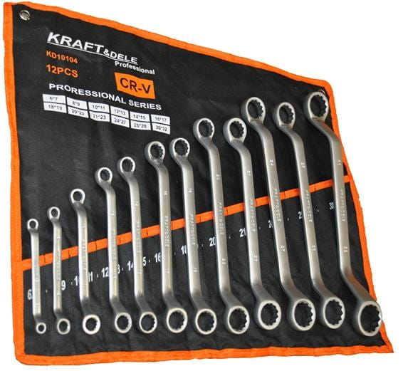 Zestaw 12 dwustronnych kluczy oczkowych giętych ze stali chromowo-wanadowej, przeznaczonych do pracy zarówno w warunkach domowych, jak i w profesjonalnym warsztacie. Narzędzia spełniają wymagania normy DIN 3113, która określa tolerancje wymiarowe i wytrzymałość mechaniczną kluczy oczkowych.