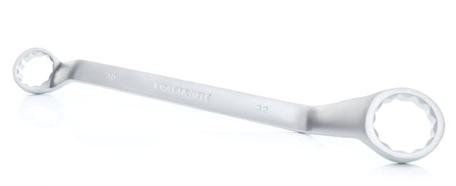 Odgięcie główek kluczy (standardowo 15°) umożliwia pracę w miejscach z ograniczonym dostępem, gdzie płaskie narzędzie nie może być swobodnie obracane. Obustronne oczko pozwala na obsługę dwóch rozmiarów jednym narzędziem.