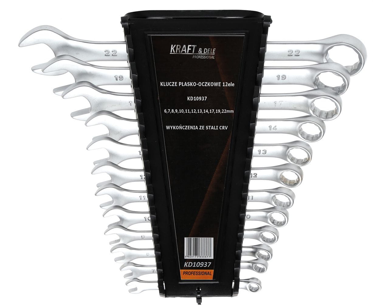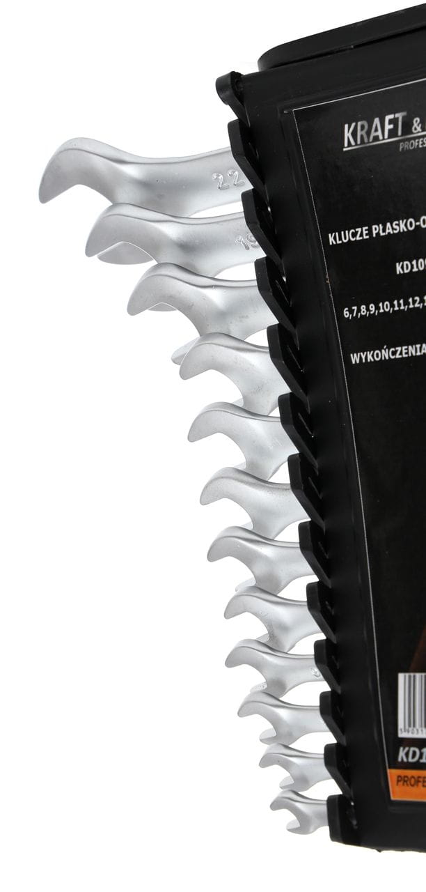 Zestaw 12 kluczy płasko-oczkowych wykonanych ze stali chromowo-wanadowej (CrV). Każdy klucz łączy dwa typy końcówek — płaską i oczkową — co pozwala na pracę w miejscach o różnym dostępie do łącznika. Zestaw obejmuje szeroki zakres rozmiarów, od 6 do 22 mm, z uwzględnieniem popularnych w motoryzacji i przemyśle wymiarów 17, 19 i 22 mm.
