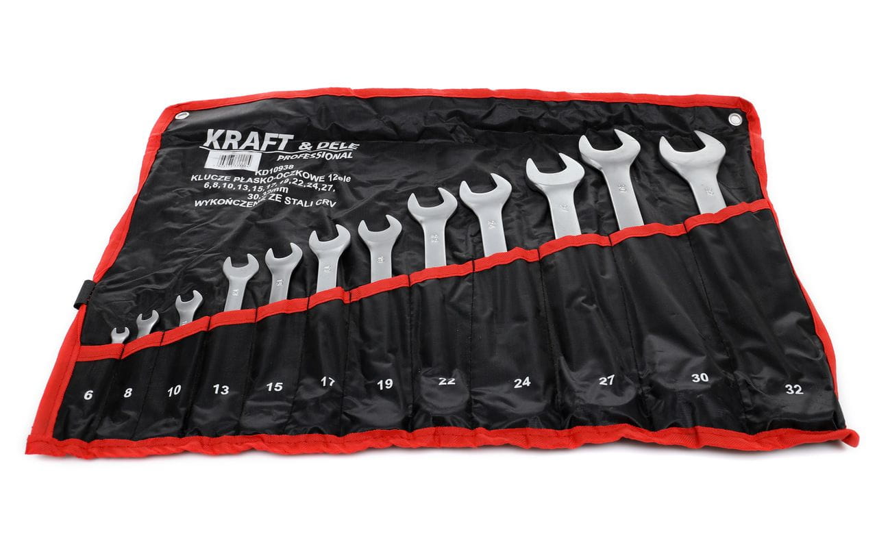 Zestaw 12 kluczy płasko-oczkowych ze stali chromowo-wanadowej (CRV), obejmujący rozmiary od 6 do 32 mm. Połączenie końcówki płaskiej i oczkowej w jednym narzędziu pozwala na pracę w różnych warunkach dostępu do łącznika — zarówno tam, gdzie wymagany jest pełny obrót, jak i tam, gdzie przestrzeń jest ograniczona.