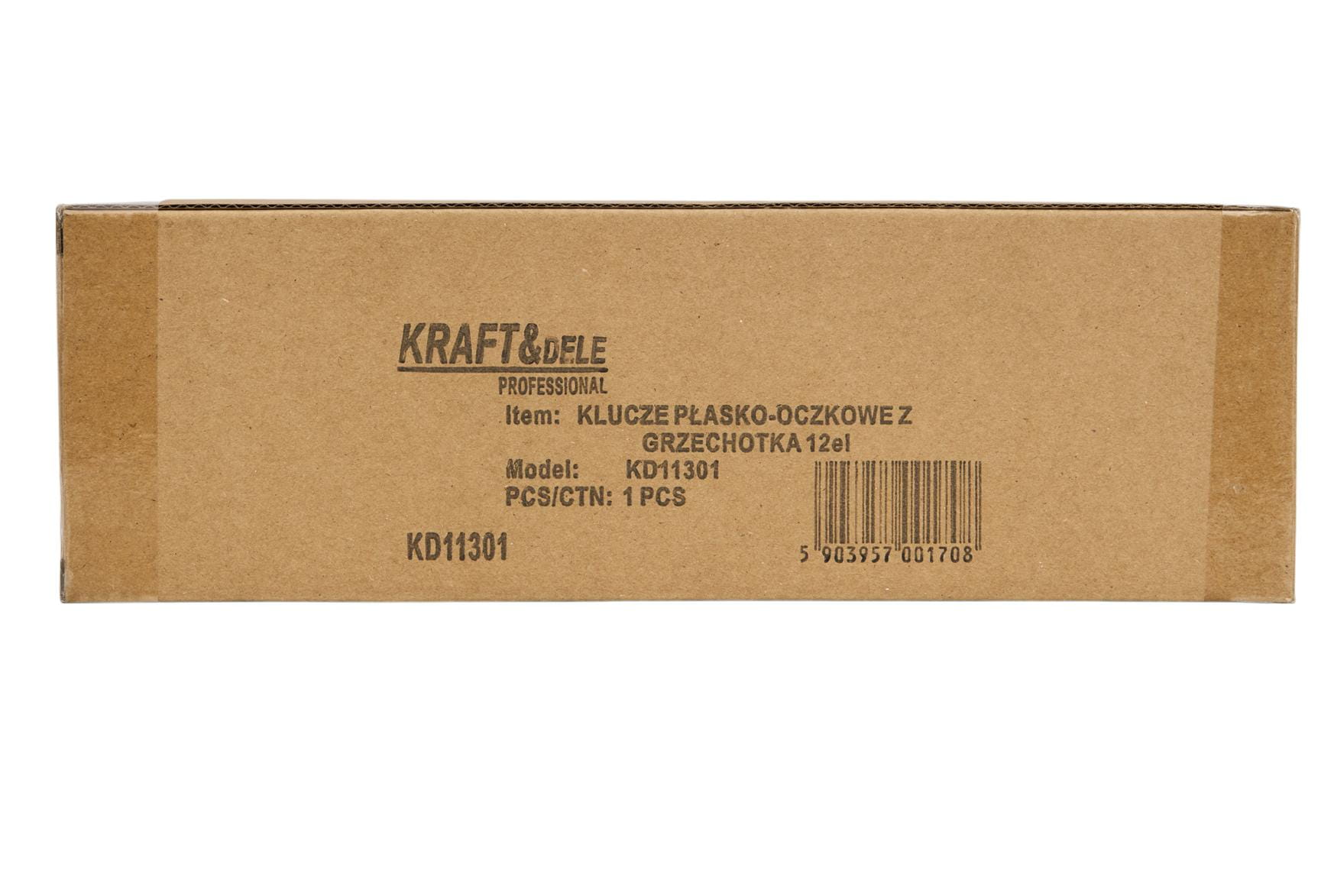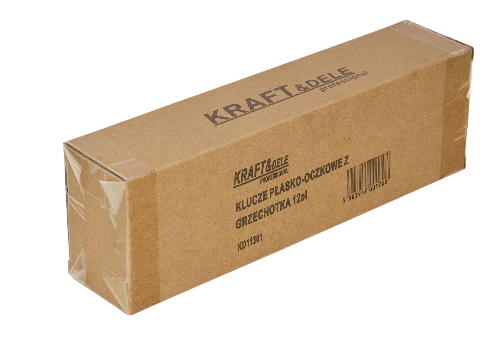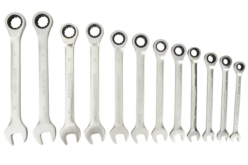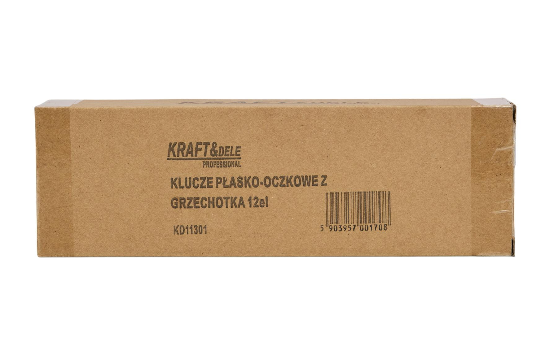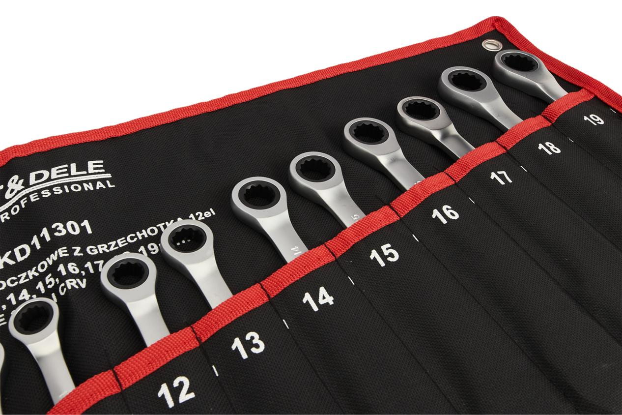 Zestaw 12 dwustronnych kluczy płasko-oczkowych wyposażonych w mechanizm grzechotkowy. Każdy klucz łączy końcówkę płaską z oczkową w zakresie rozmiarów od 8 do 19 mm. Mechanizm grzechotki eliminuje konieczność przekładania klucza po każdym obrocie, co przyspiesza pracę przy montażu i demontażu połączeń śrubowych. Klucze wykonano ze stali chromowo-wanadowej (CrV) z zabezpieczeniem antykorozyjnym.