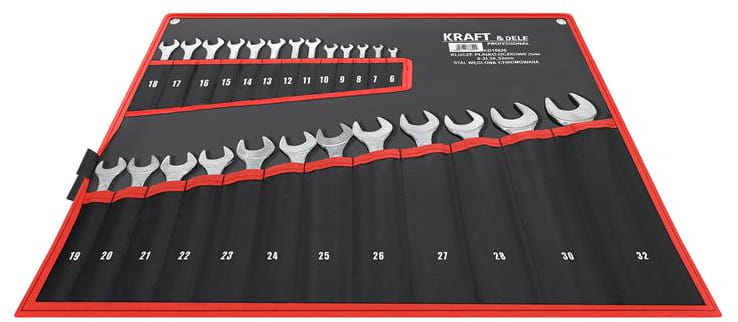 Zestaw pokrywa rozmiary 6–28 mm w pełnym zakresie, a dodatkowo zawiera klucze 30 i 32 mm. Dzięki temu jeden komplet wystarcza do obsługi zarówno drobnych połączeń, jak i większych śrub stosowanych w konstrukcjach mechanicznych i instalacjach.
