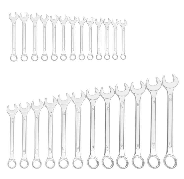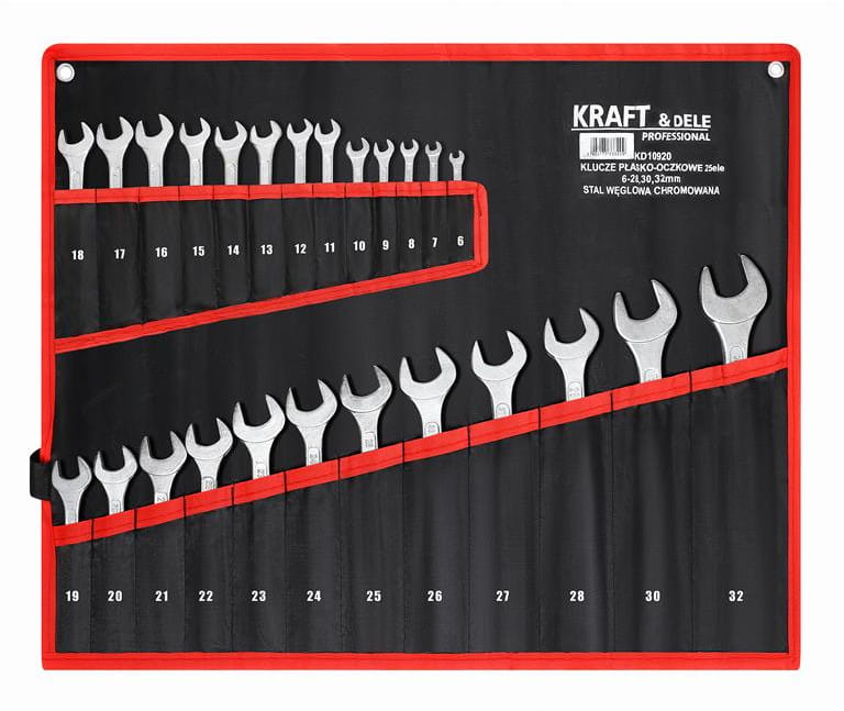 Zestaw 25 kluczy płasko-oczkowych wykonanych ze stali węglowej chromowanej, obejmujący rozmiary od 6 do 32 mm. Każdy klucz łączy w sobie dwie końcówki — płaską i oczkową — co umożliwia pracę w różnych warunkach dostępu do łączników bez konieczności zmiany narzędzia.