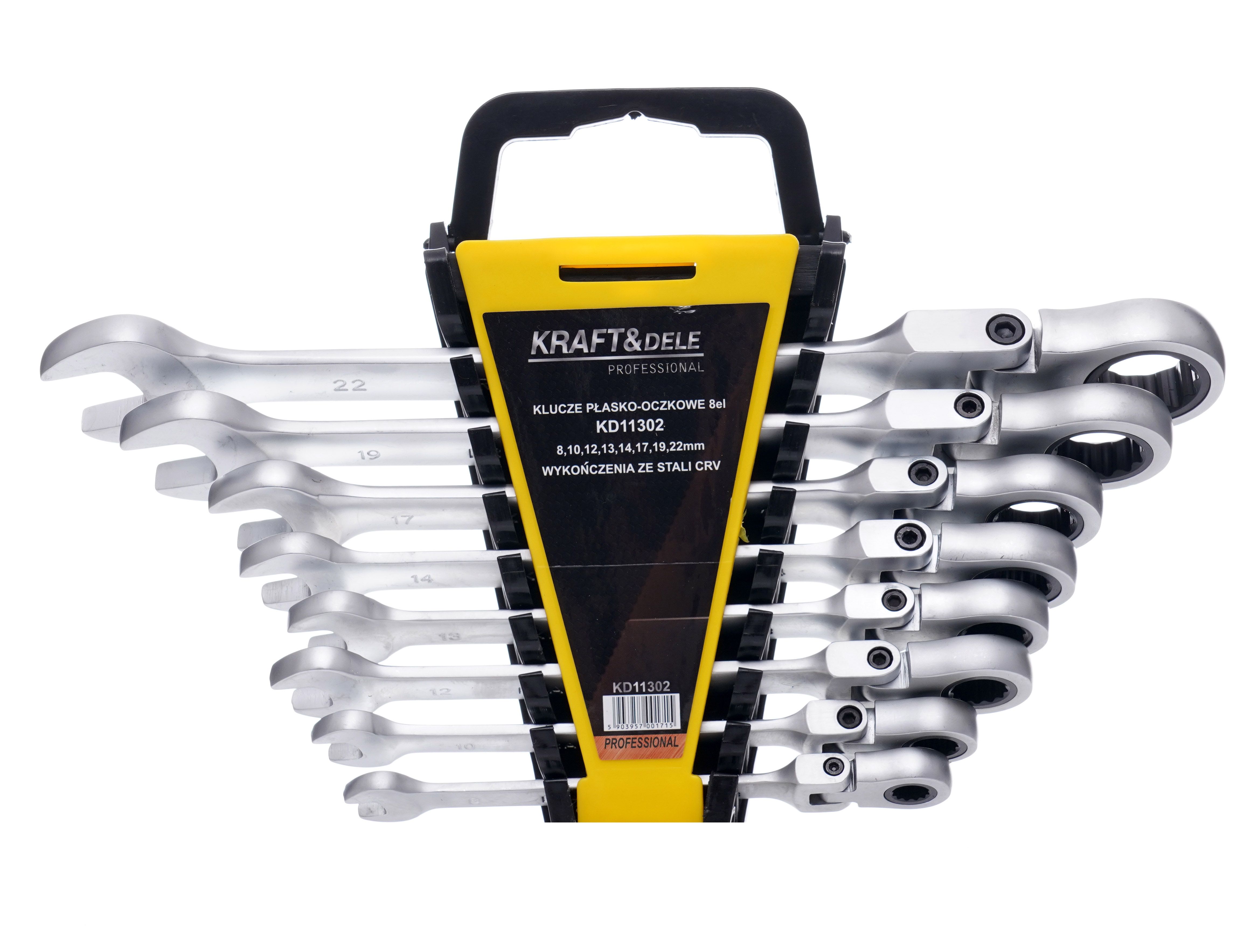 KLUCZE PŁASKO-OCZKOWE 8szt. KD11302 / KD11302 / KRAFT&DELE to praktyczny zestaw do sprawnego odkręcania i dokręcania w warunkach warsztatowych i instalacyjnych. Model KD11302 łączy kompaktowy rozmiar z funkcją grzechotki, dzięki czemu przyspiesza pracę bez ciągłego przekładania klucza.