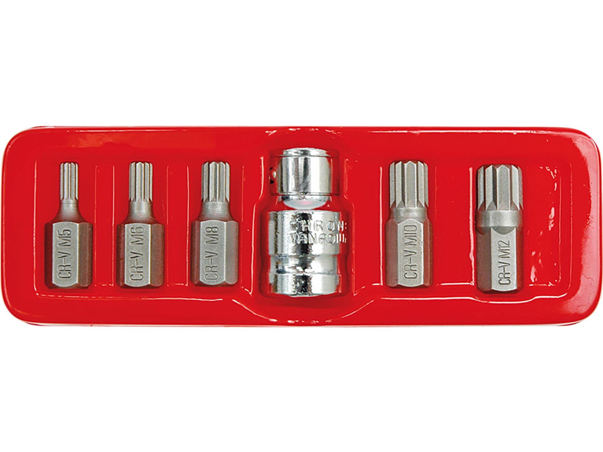 Zestaw sześciu kluczy spline w rozmiarach M5-M12 marki VOREL. Profil spline zapewnia większą powierzchnię styku z łbem śruby niż standardowe klucze imbusowe, redukując ryzyko uszkodzenia gniazda i umożliwiając przenoszenie większych momentów obrotowych.