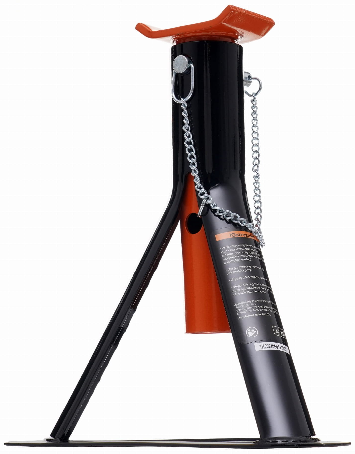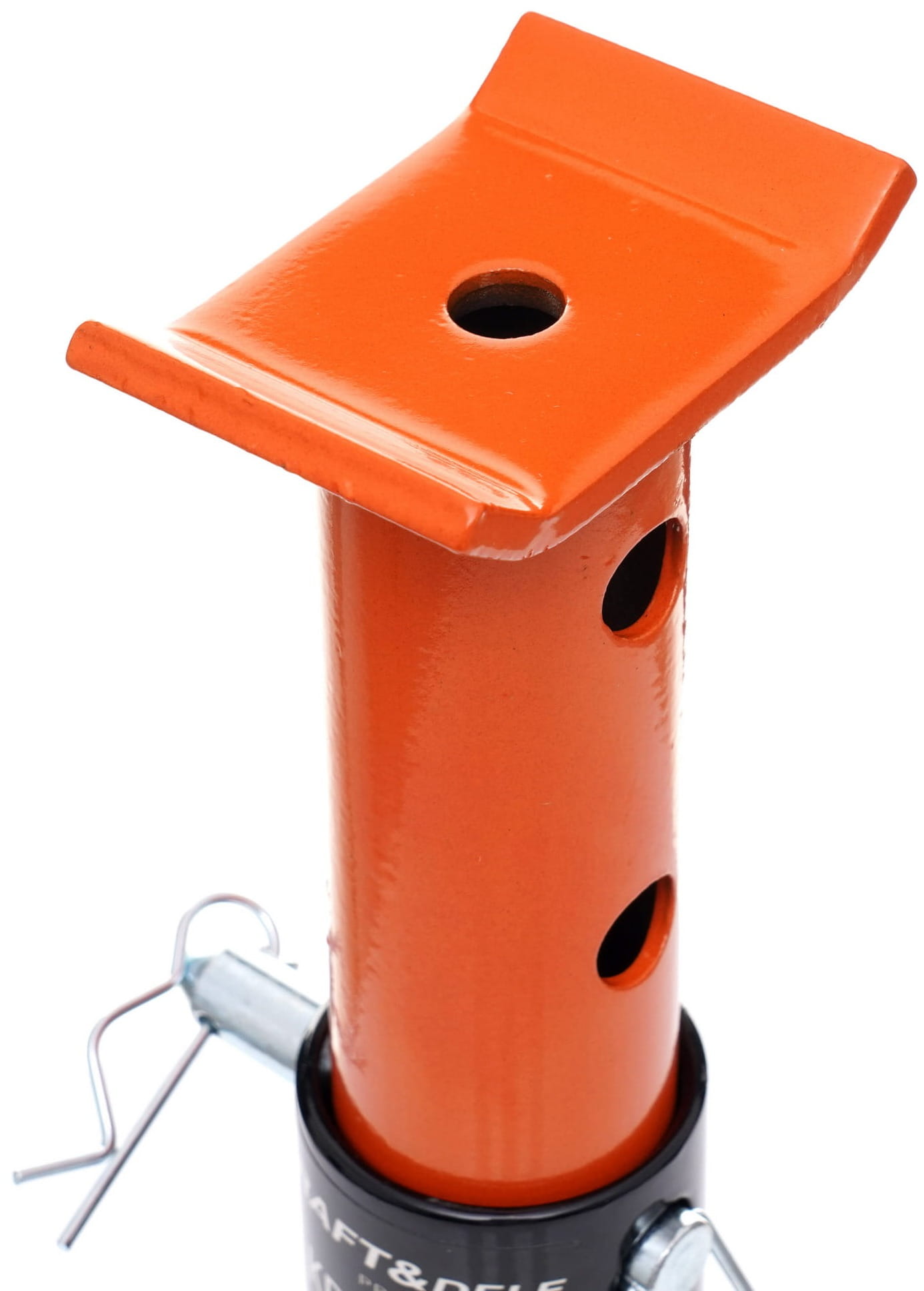 Metalowa zawleczka blokuje drążek regulacyjny w wybranej pozycji, uniemożliwiając jego przypadkowe wysunięcie się pod obciążeniem. Jest to kluczowy element bezpieczeństwa — praca pod pojazdem bez takiego zabezpieczenia wiąże się z poważnym ryzykiem.
