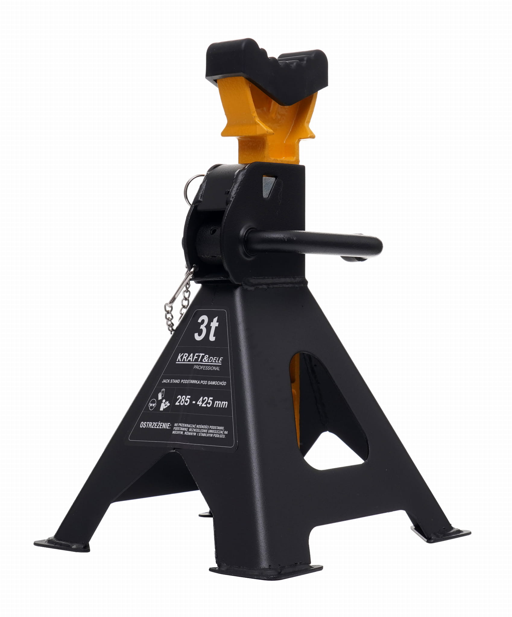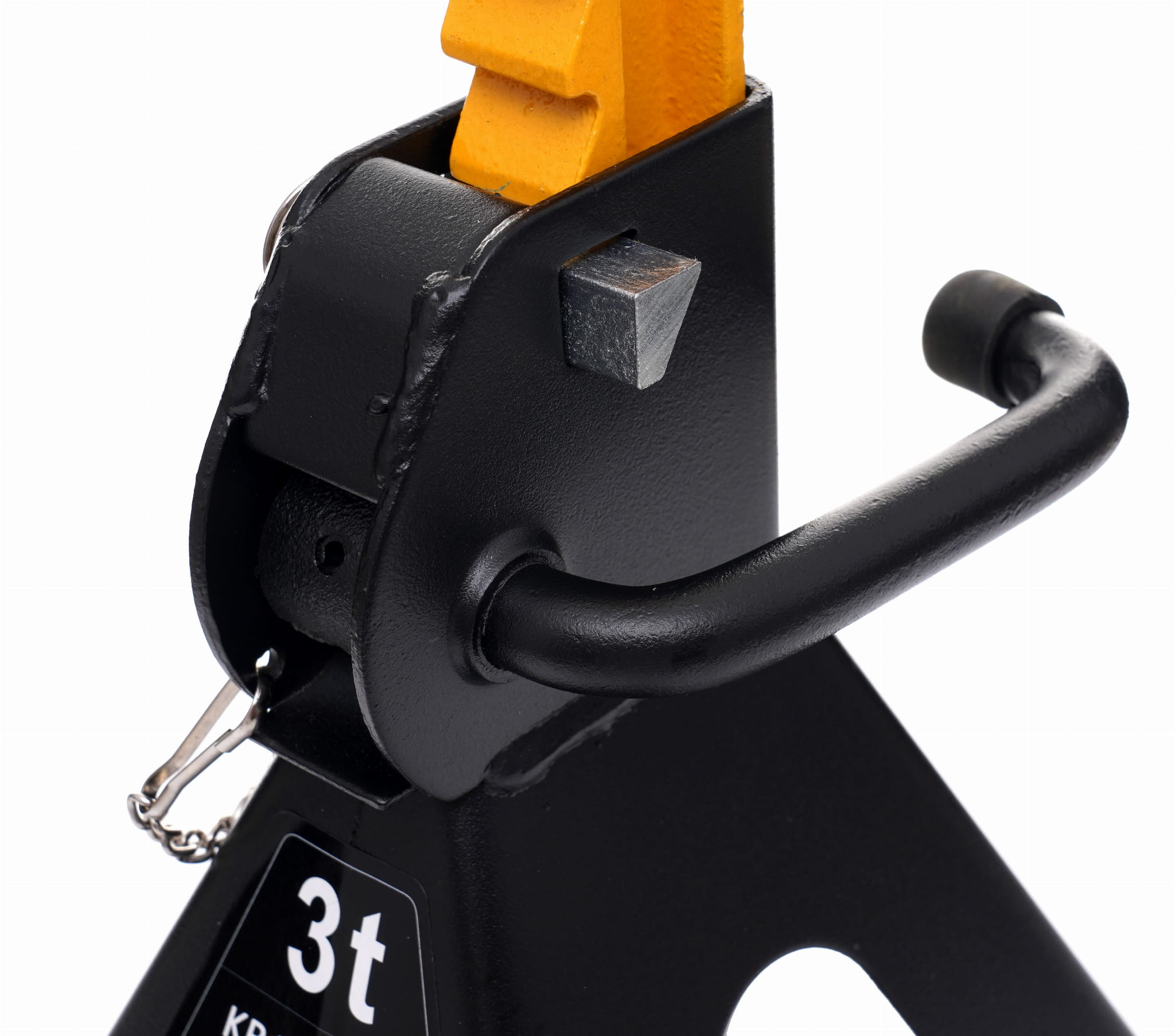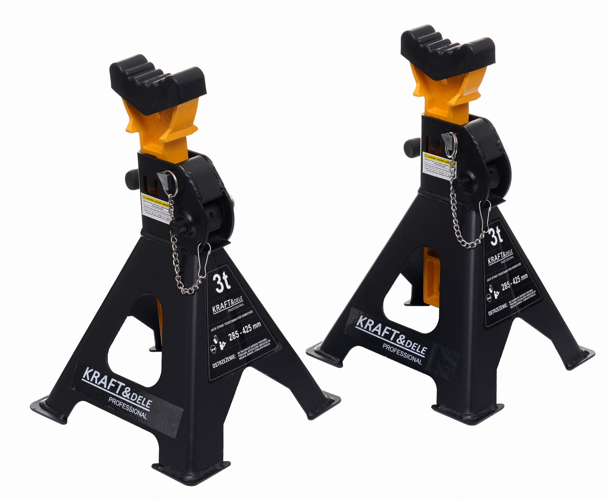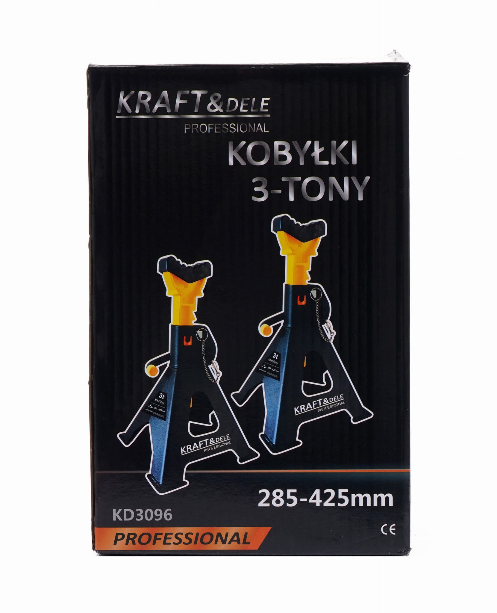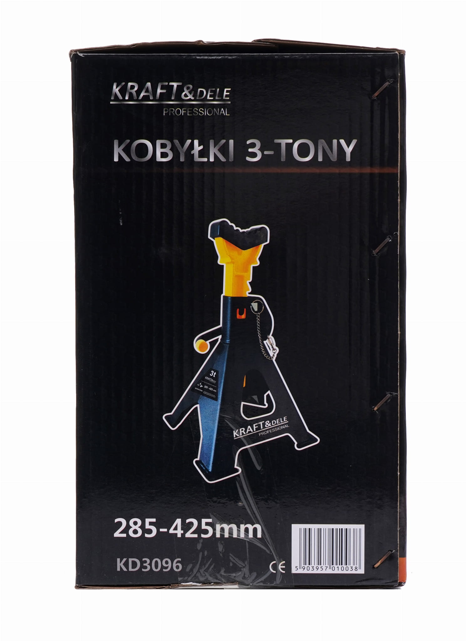 Stalowe podstawki warsztatowe do podparcia pojazdów i innych obiektów o masie do 3000 kg. Zestaw dwóch kobyłek z mechanizmem zapadkowym umożliwiającym wielostopniową regulację wysokości w zakresie 285–425 mm.