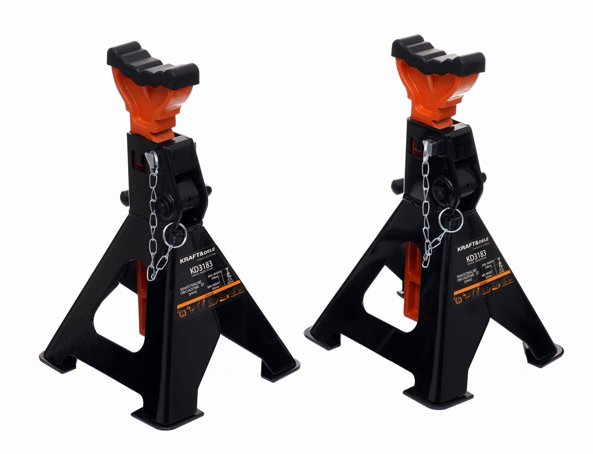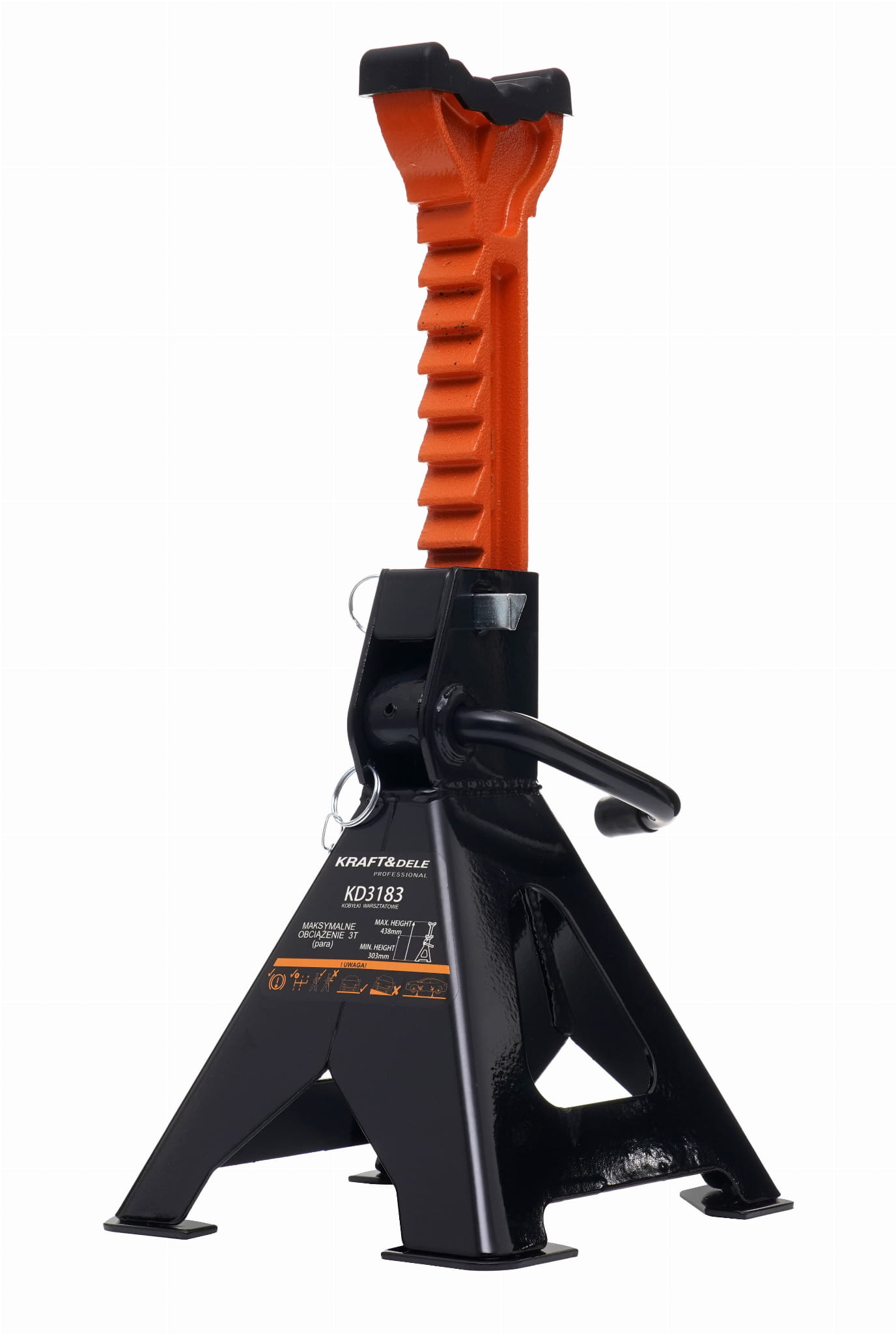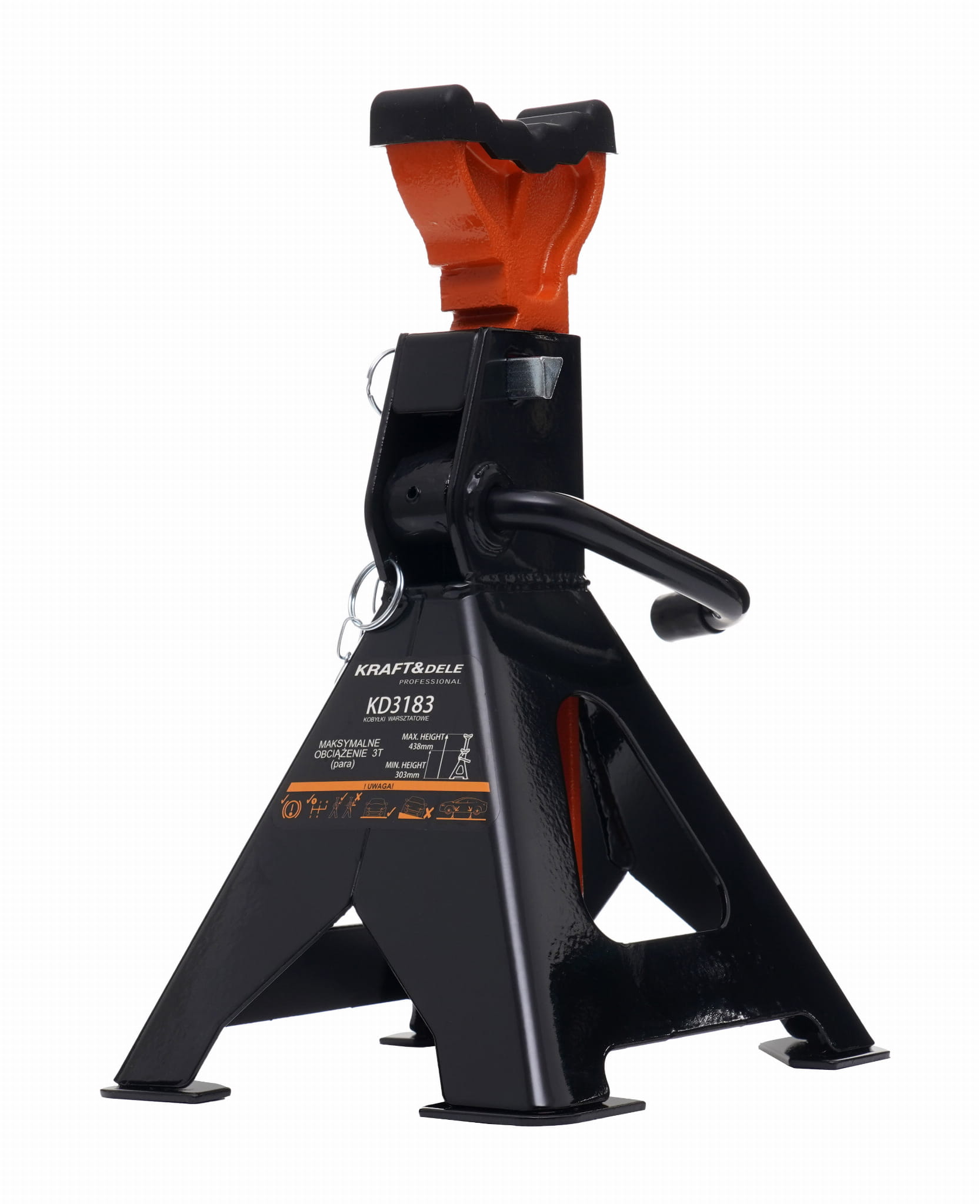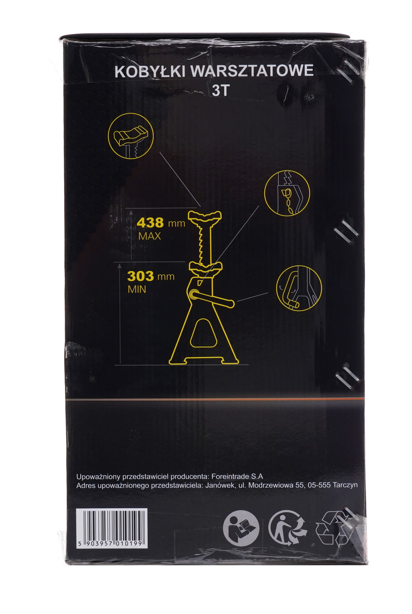 Kobyłki samochodowe KD3183 to stalowe podpory warsztatowe przeznaczone do podtrzymywania pojazdu po jego uniesieniu podnośnikiem. Model oferuje udźwig 3 ton na parę, zakres regulacji wysokości 303–438 mm oraz 10-stopniowy mechanizm zapadkowy. Zestaw zawiera 2 sztuki.