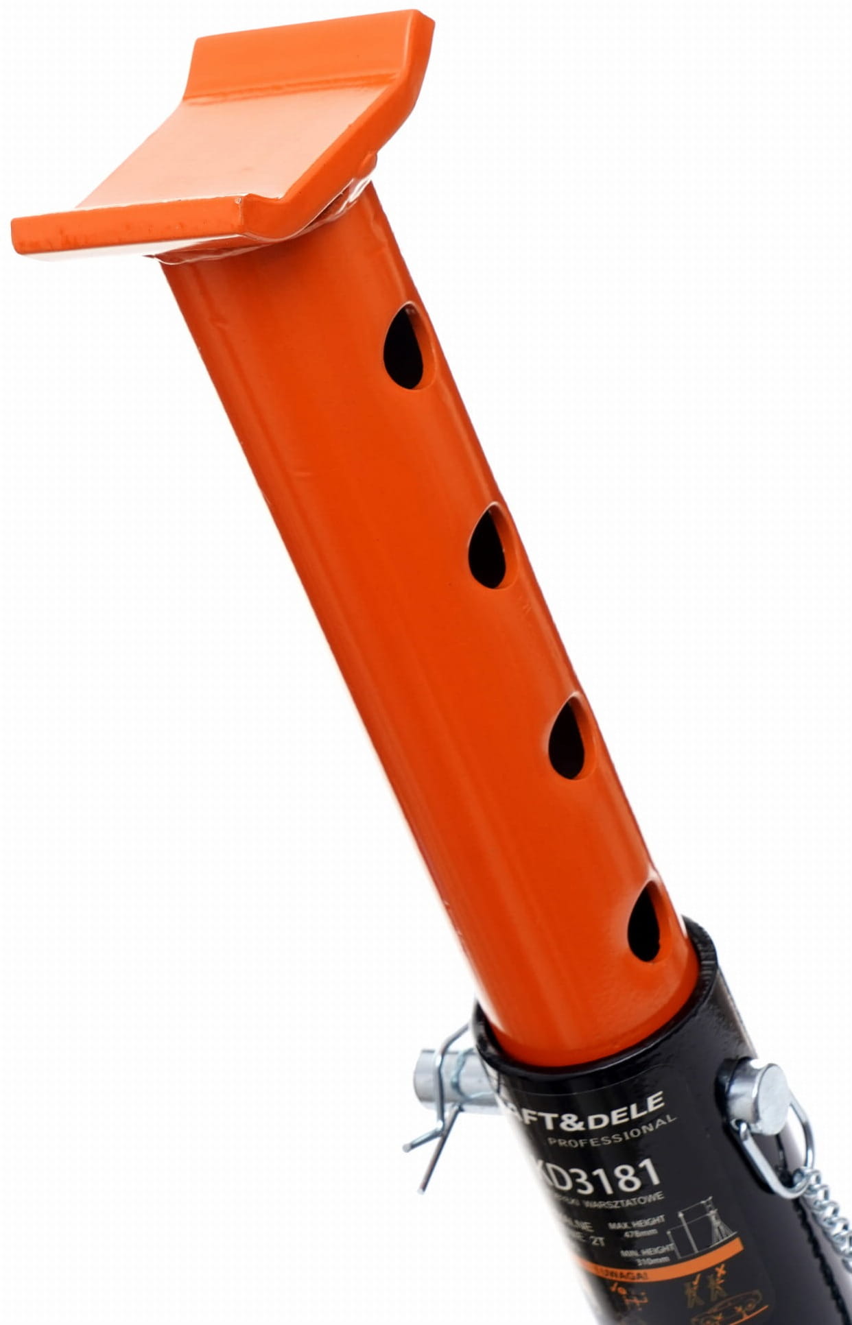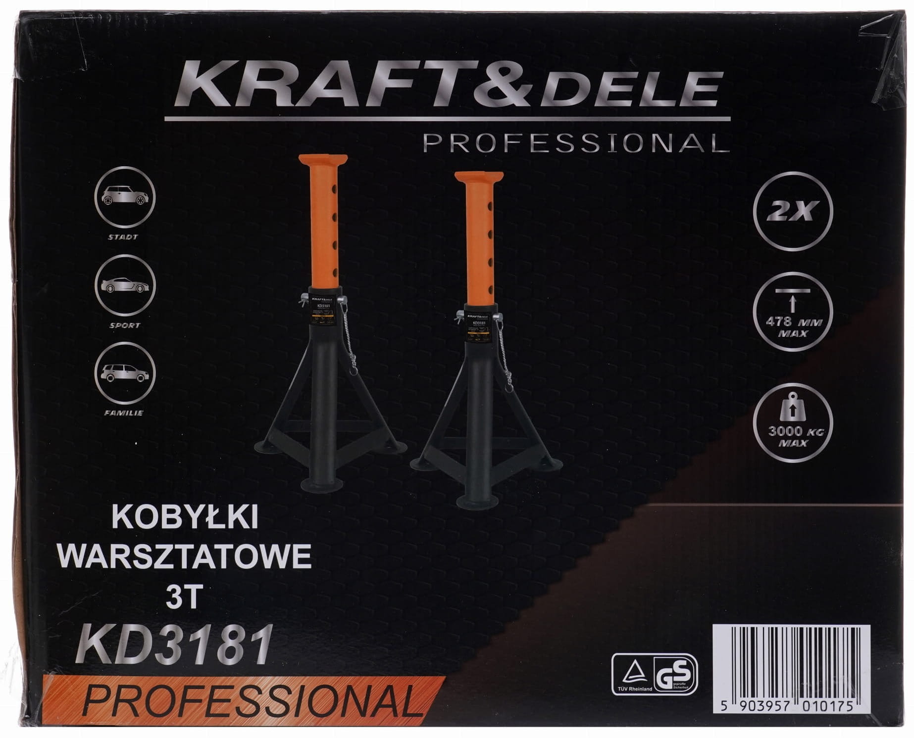KD3181 to stalowe podpory warsztatowe przeznaczone do podtrzymywania pojazdu uniesionego podnośnikiem podczas prac serwisowych. Zestaw obejmuje dwie kobyłki o udźwigu 3 ton każda, z regulowaną wysokością siodła i trójnożną podstawą stabilizującą pozycję na podłożu garażowym lub warsztatowym.