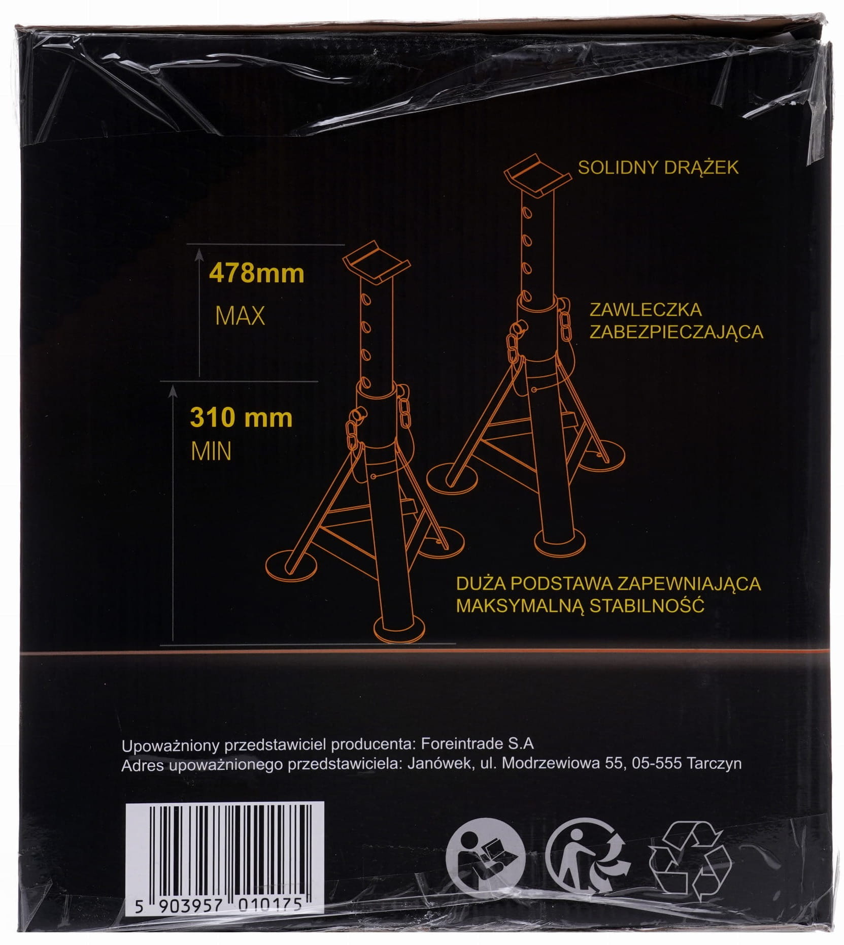 Kobyłki należy ustawiać wyłącznie pod wyznaczonymi przez producenta pojazdu punktami podparcia. Przed obciążeniem trzeba upewnić się, że mechanizm zapadkowy jest prawidłowo zablokowany, a podstawa spoczywa stabilnie na równym, twardym podłożu. Nie należy przekraczać nominalnego udźwigu 3T na sztukę. Kobyłki służą do podtrzymywania uniesionego pojazdu — nie zastępują podnośnika podczas podnoszenia.