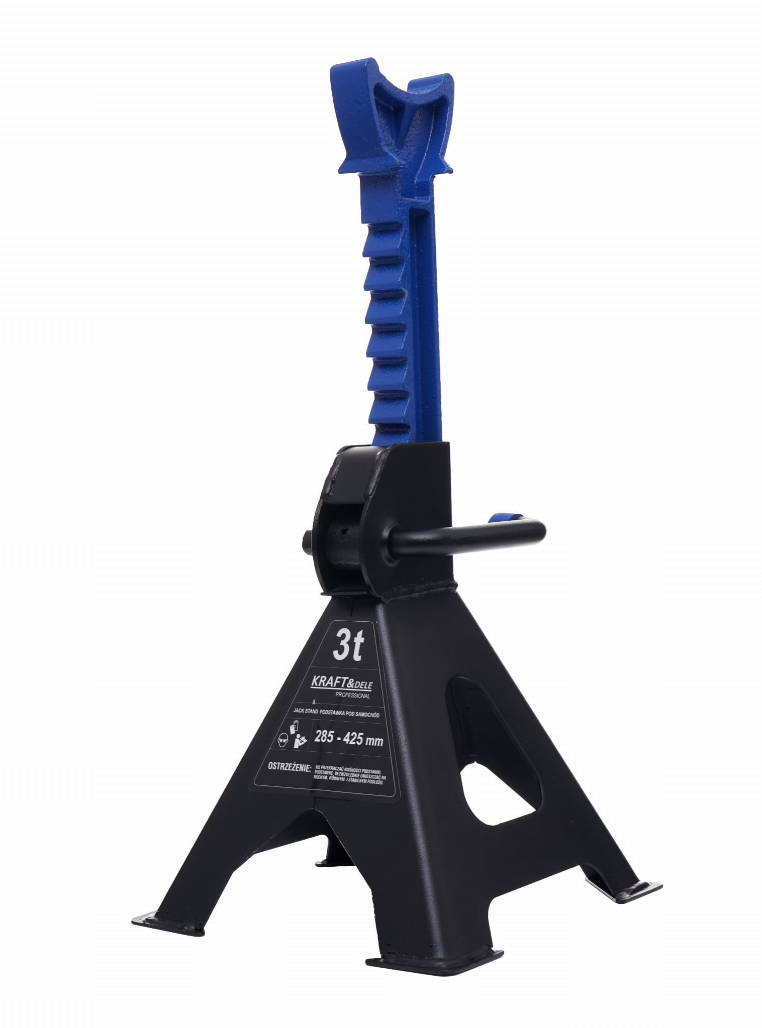 Regulacja wysokości odbywa się stopniowo za pomocą mechanizmu zapadkowego. Pozwala to na precyzyjne ustawienie kobyłki na wybranym poziomie i pewne zablokowanie pozycji bez ryzyka samoczynnego obniżenia się podpory podczas pracy pod pojazdem.