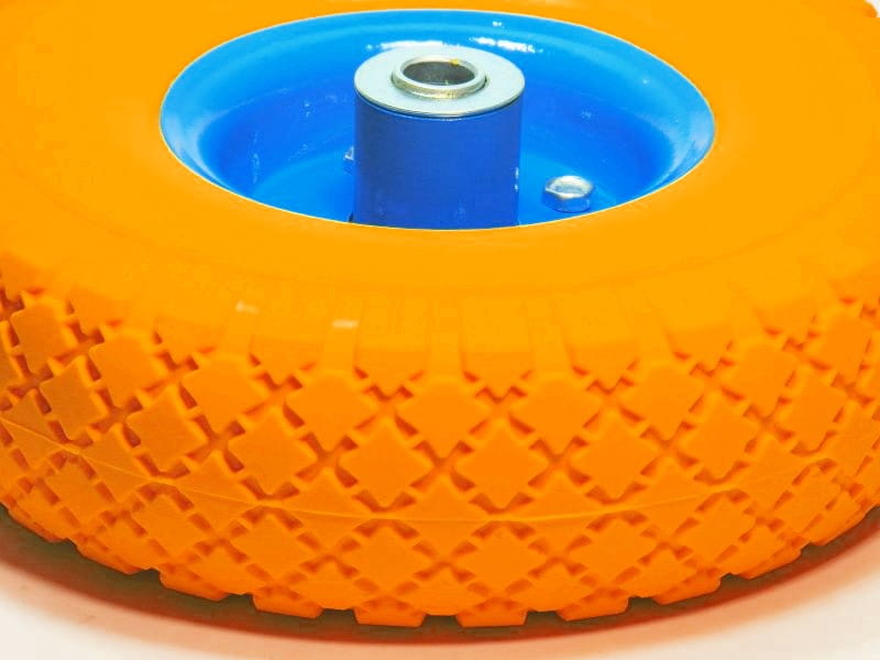 Koło wykonano w całości z poliuretanu, który nie wymaga pompowania i nie posiada dętki ani komory powietrznej. Wyklucza to możliwość przebicia przez gwoździe, śruby czy inne ostre elementy obecne na placach budowy lub w halach magazynowych.